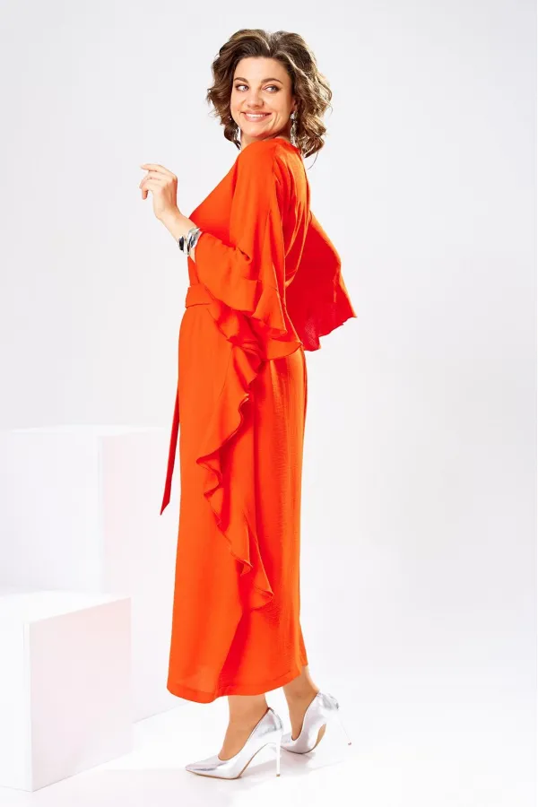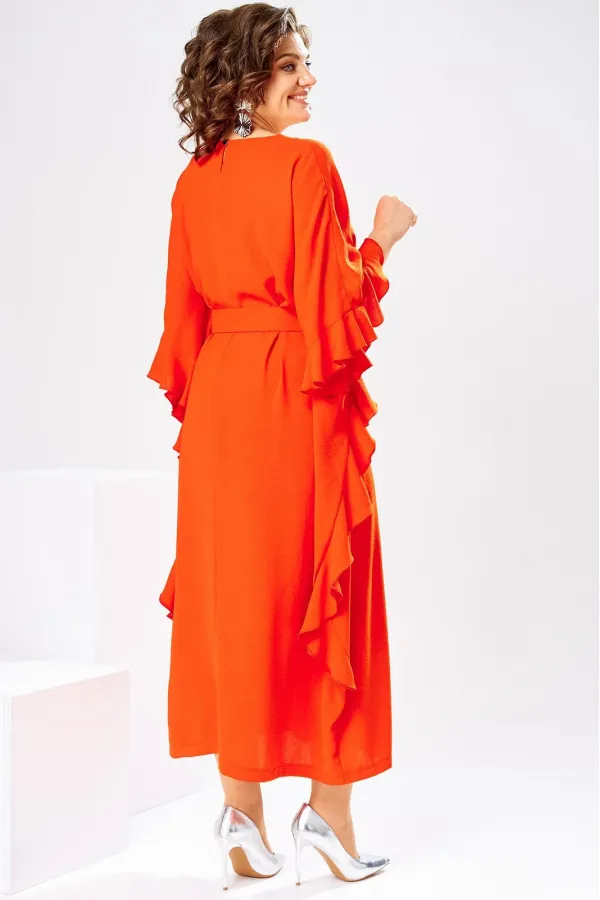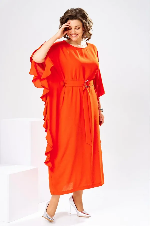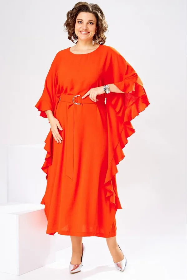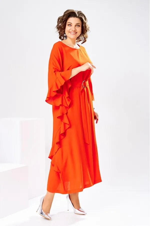 Платье женское, относится к нарядной торжественной одежде. Платье пончо свободного кроя, длинное. Перед цельнокроеный. Спинка со средним швом, вверху с разрезом, фиксирующимся по горловине на 1-ну навесную петлю и 1-ну пришивную пуговицу. Горловина круглая, обточная, без воротника, по переду горловины отделочная строчка 0,6 см. Рукав цельнокроеный удлинённый. Низ рукава и боковые швы декорированы приточной оборкой. По боковым швам зафиксирован уровень пройм и место расположения петель на уровне линии талии отделочными строчками. К платью прилагается съёмный пояс с пряжкой, фиксируемые на платье в петли на уровне линии талии. Платье без плечевых накладок. Длина спинки платья 132 см, ширина на уровне глубины проймы 66 см, ширина по линии талии 66 см, ширина плеча+длина рукава 56,5 см.