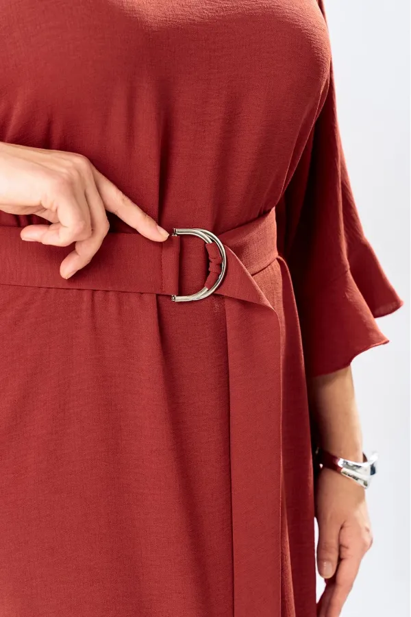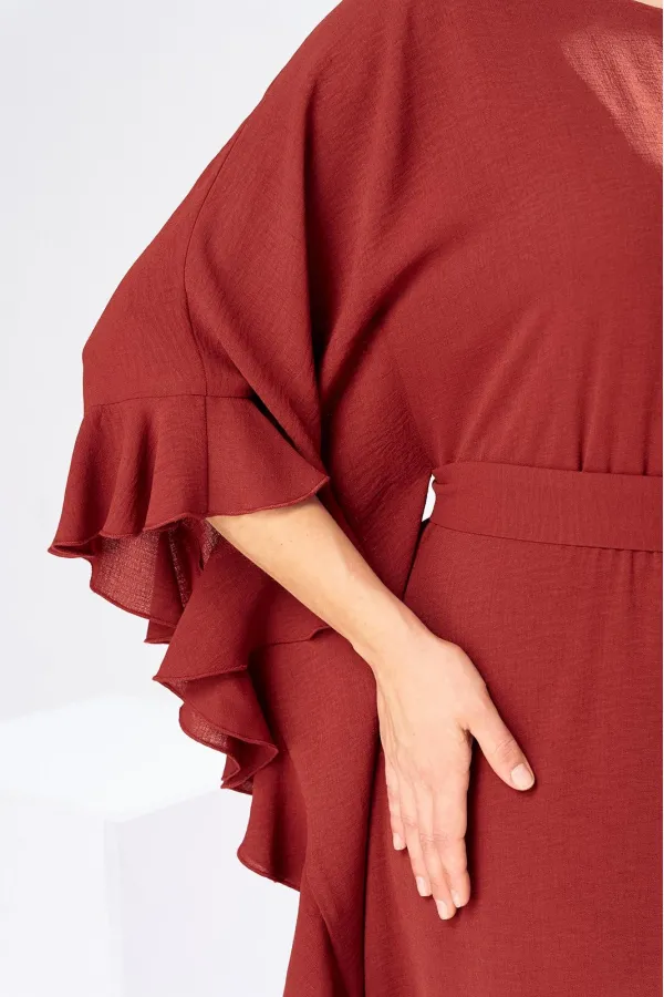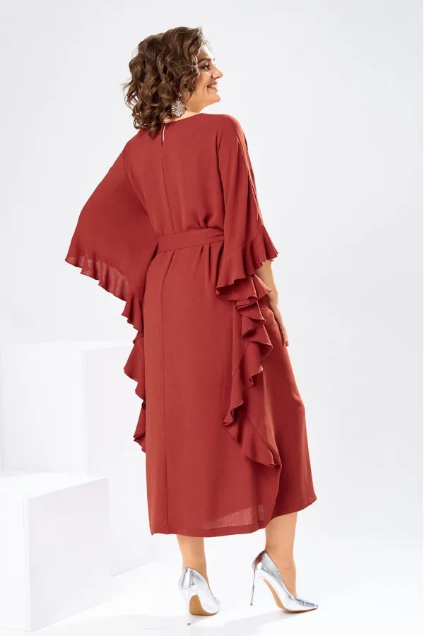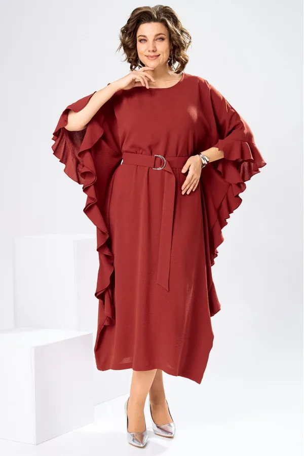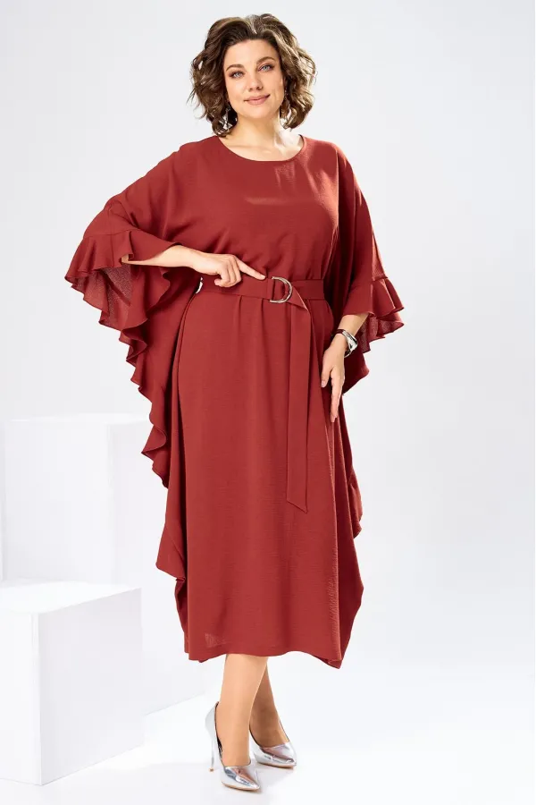 Платье женское, относится к нарядной торжественной одежде. Платье пончо свободного кроя, длинное. Перед цельнокроеный. Спинка со средним швом, вверху с разрезом, фиксирующимся по горловине на 1-ну навесную петлю и 1-ну пришивную пуговицу. Горловина круглая, обточная, без воротника, по переду горловины отделочная строчка 0,6 см. Рукав цельнокроеный удлинённый. Низ рукава и боковые швы декорированы приточной оборкой. По боковым швам зафиксирован уровень пройм и место расположения петель на уровне линии талии отделочными строчками. К платью прилагается съёмный пояс с пряжкой, фиксируемые на платье в петли на уровне линии талии. Платье без плечевых накладок. Длина спинки платья 132 см, ширина на уровне глубины проймы 66 см, ширина по линии талии 66 см, ширина плеча+длина рукава 56,5 см.