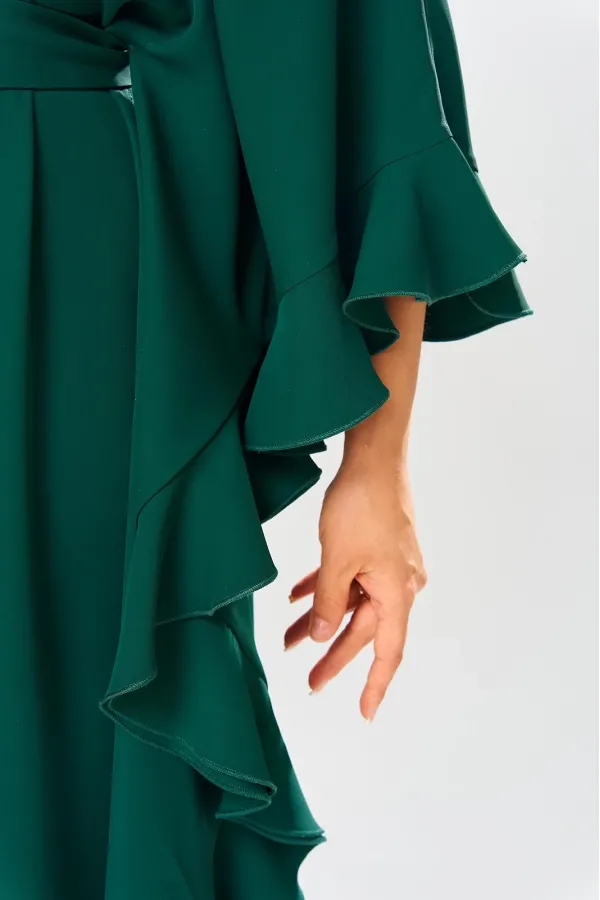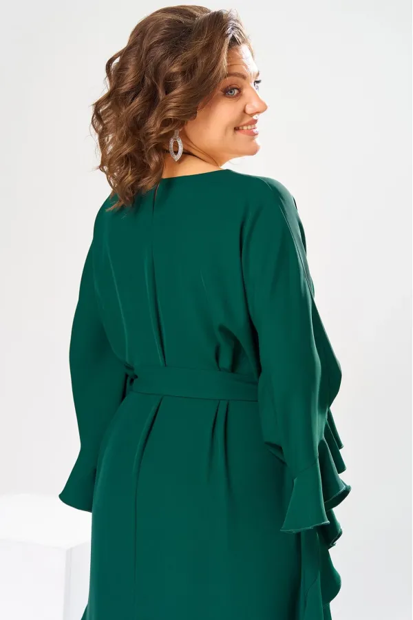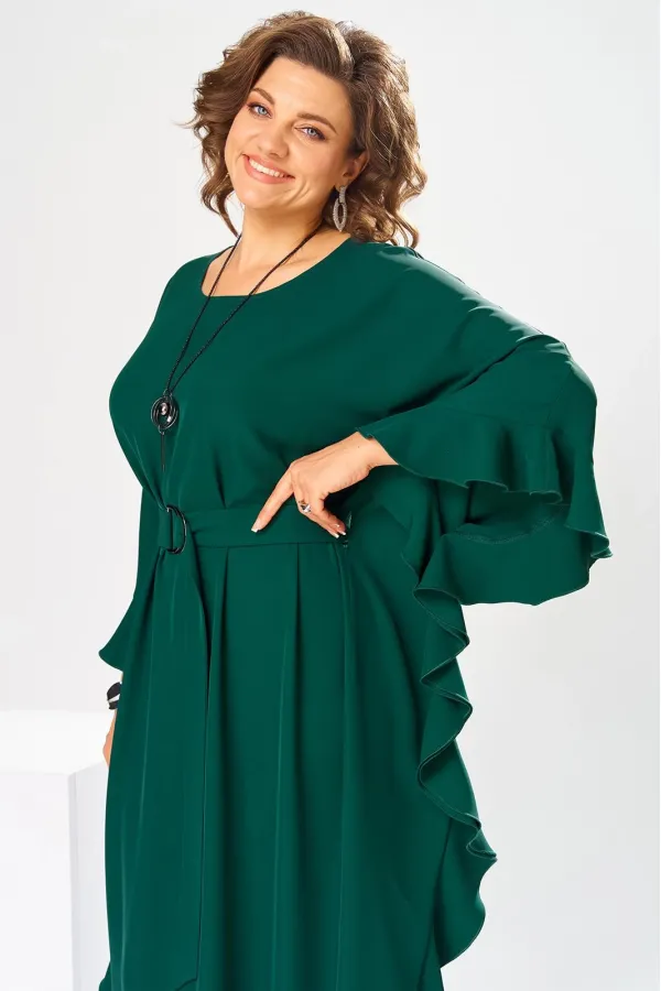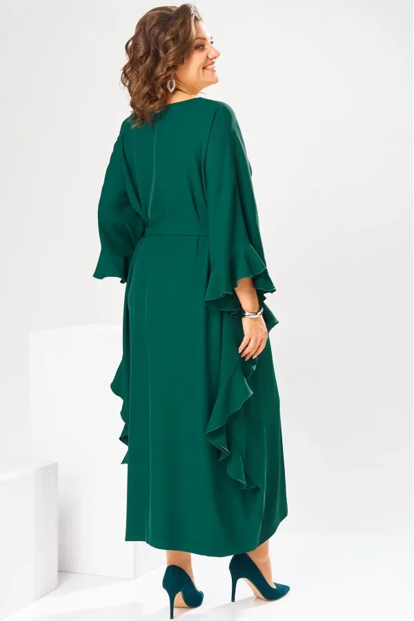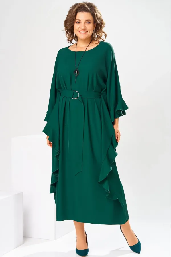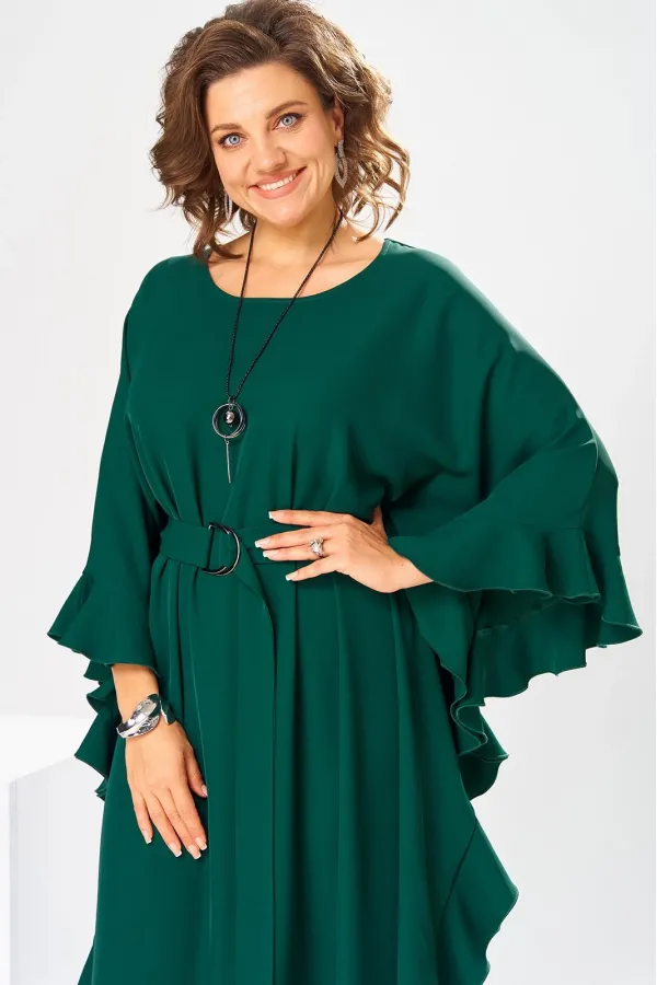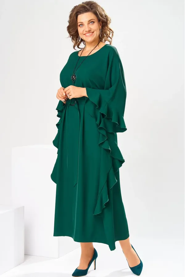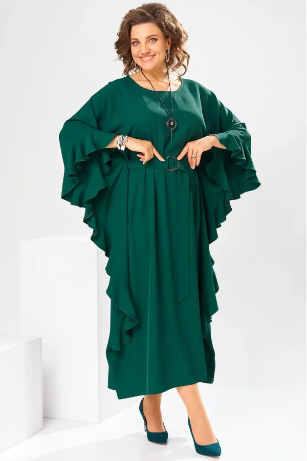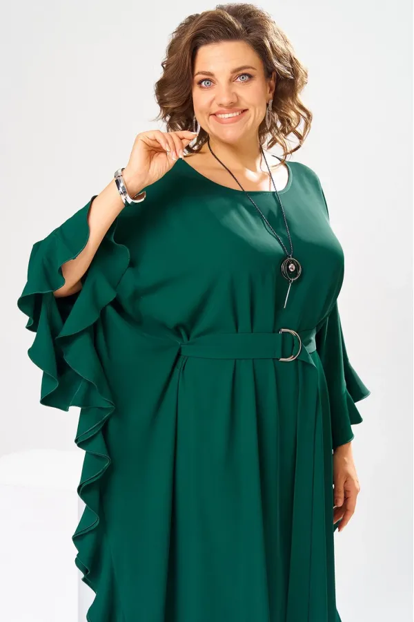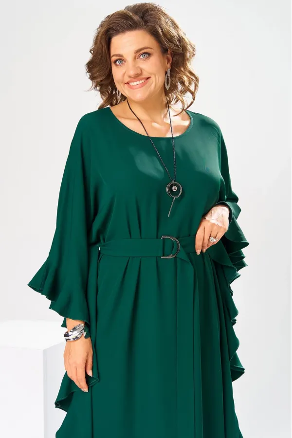 Платье женское, относится к нарядной торжественной одежде. Платье пончо свободного кроя, длинное. Перед цельнокроеный. Спинка со средним швом, вверху с разрезом, фиксирующимся по горловине на 1-ну навесную петлю и 1-ну пришивную пуговицу. Горловина круглая, обточная, без воротника, по переду горловины отделочная строчка 0,6 см. Рукав цельнокроеный удлинённый. Низ рукава и боковые швы декорированы приточной оборкой. По боковым швам зафиксирован уровень пройм и место расположения петель на уровне линии талии отделочными строчками. К платью прилагается съёмный пояс с пряжкой, фиксируемые на платье в петли на уровне линии талии. Платье без плечевых накладок. Длина спинки платья 132 см, ширина на уровне глубины проймы 66 см, ширина по линии талии 66 см, ширина плеча+длина рукава 56,5 см.