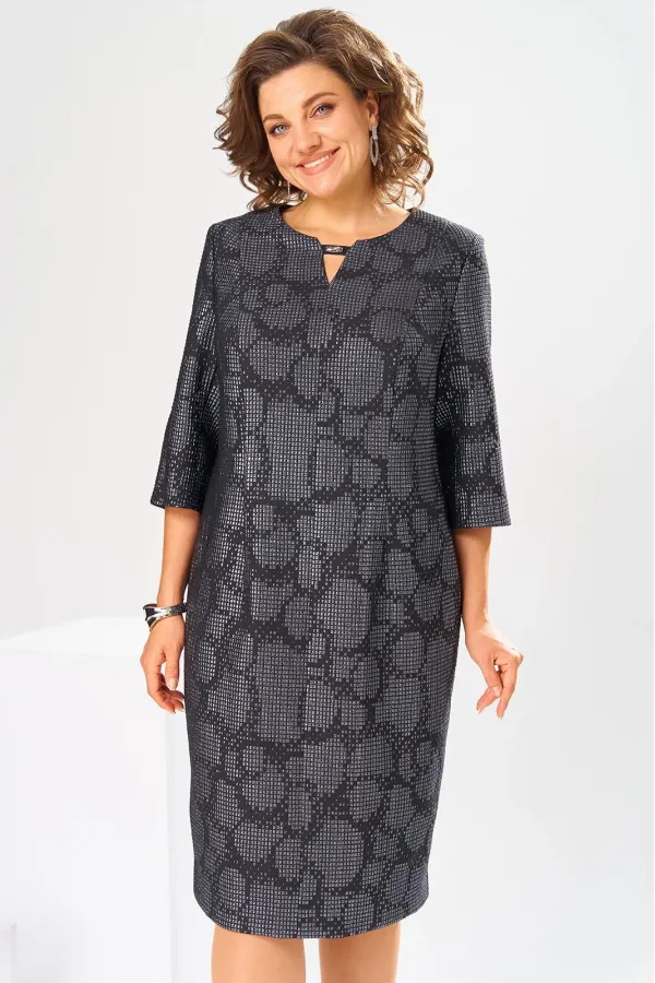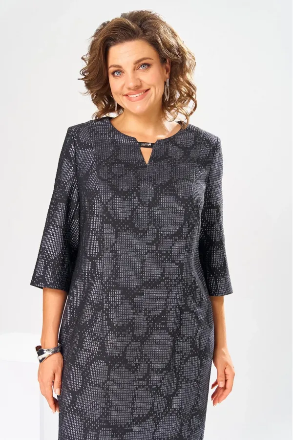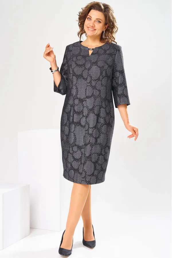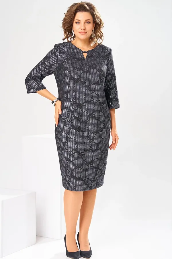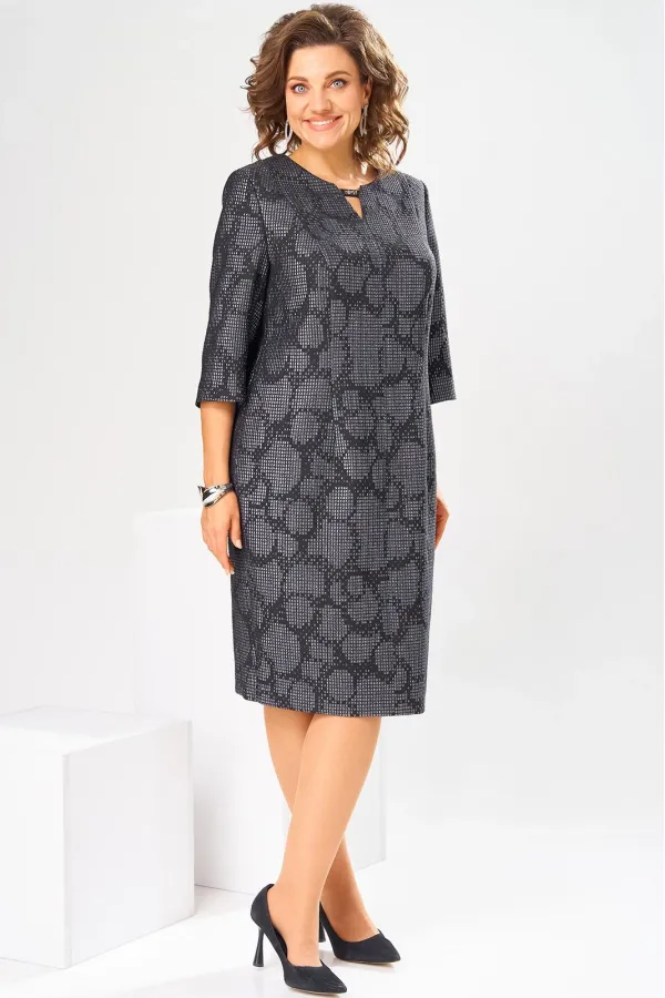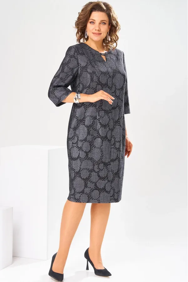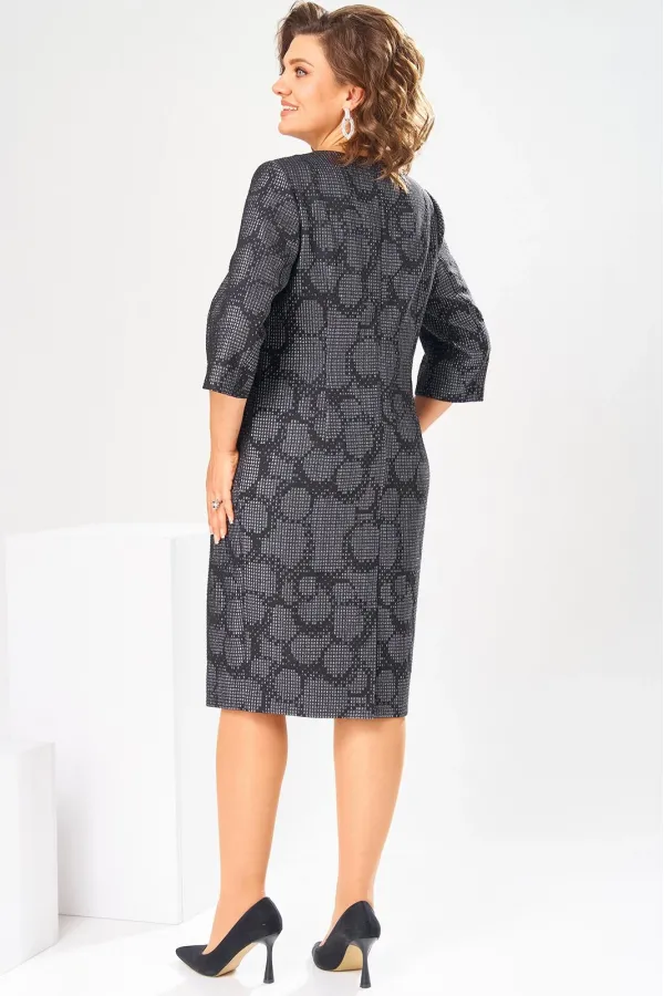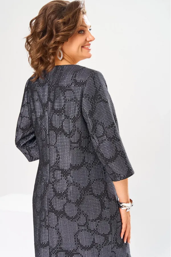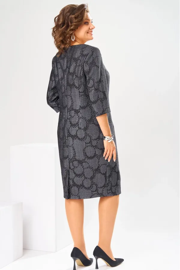 Платье относится к торжественно-нарядной одежде. Платье женское, полу прилегающего силуэта, длиной за колено. Перед с 2-мя рельефами, выходящими из плечевых швов и средним швом. Спинка с 2-мя таллиевыми вытачками и средним швом, заканчивающимся шлицей. Застёжка на потайную тесьму молнией в среднем шве спинки. Горловина круглая, обточная, без воротника с V-образным разрезом по переду, декорированным отделочной планкой, с пришивной стразой. Рукав во втачной, 2-х шовный, длиной 3/4. Платье на подкладке. Платье с плечевыми накладками. Длина платья по спинке 103 см, длина рукава 43,5 см.