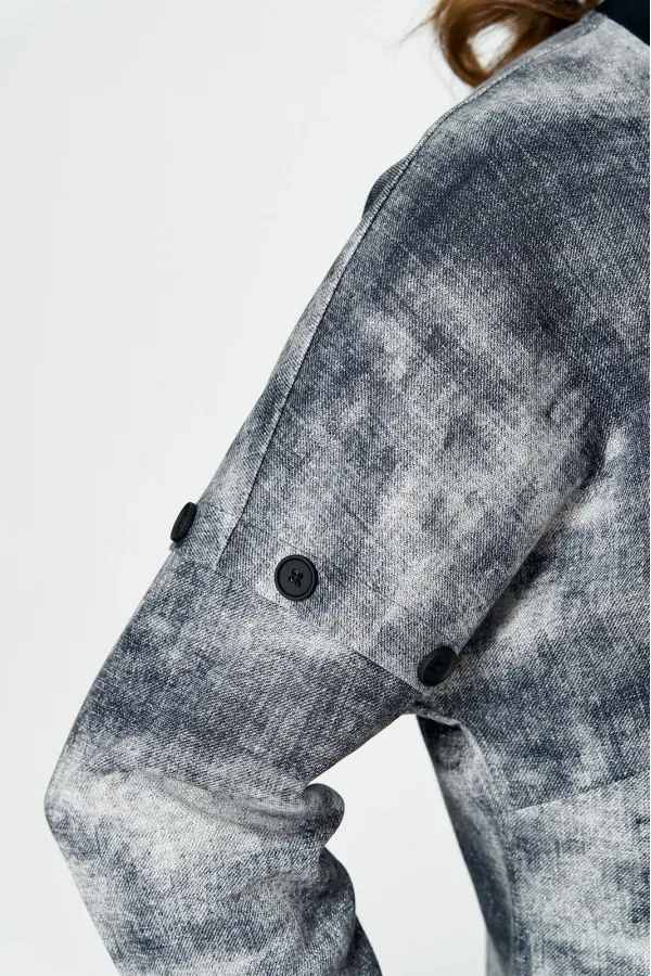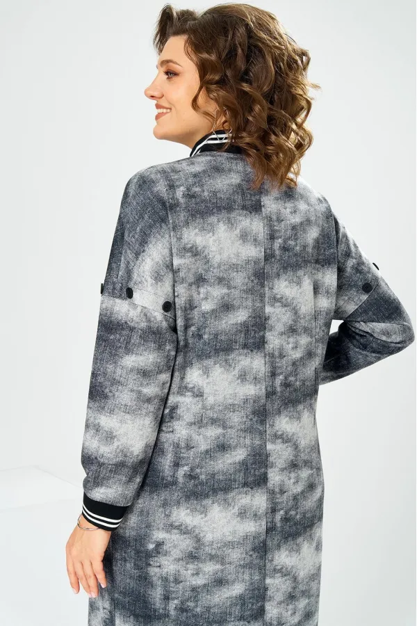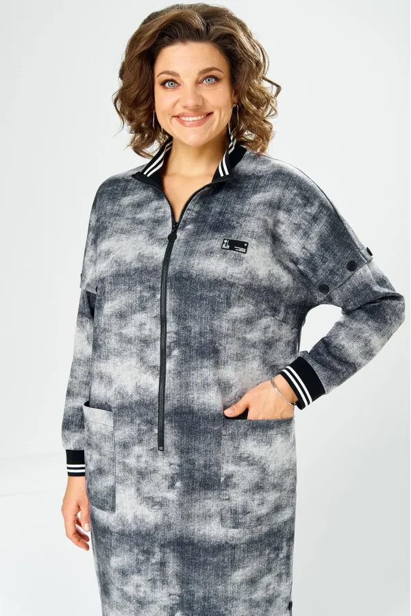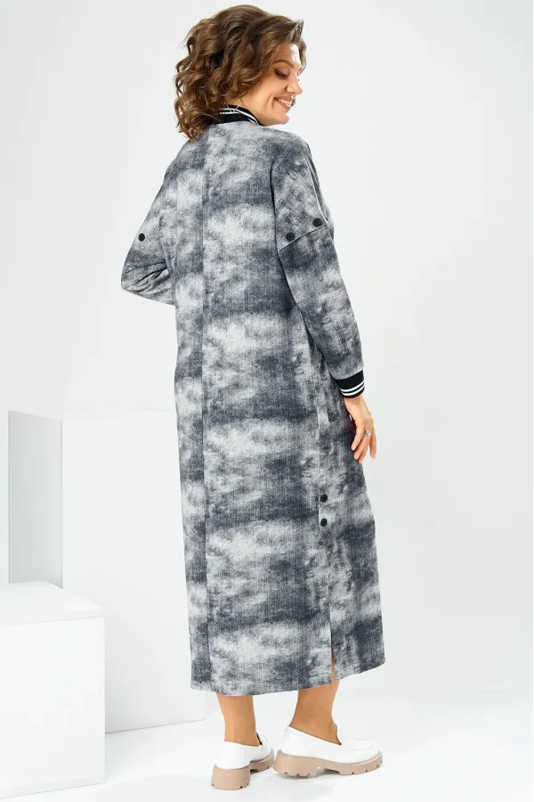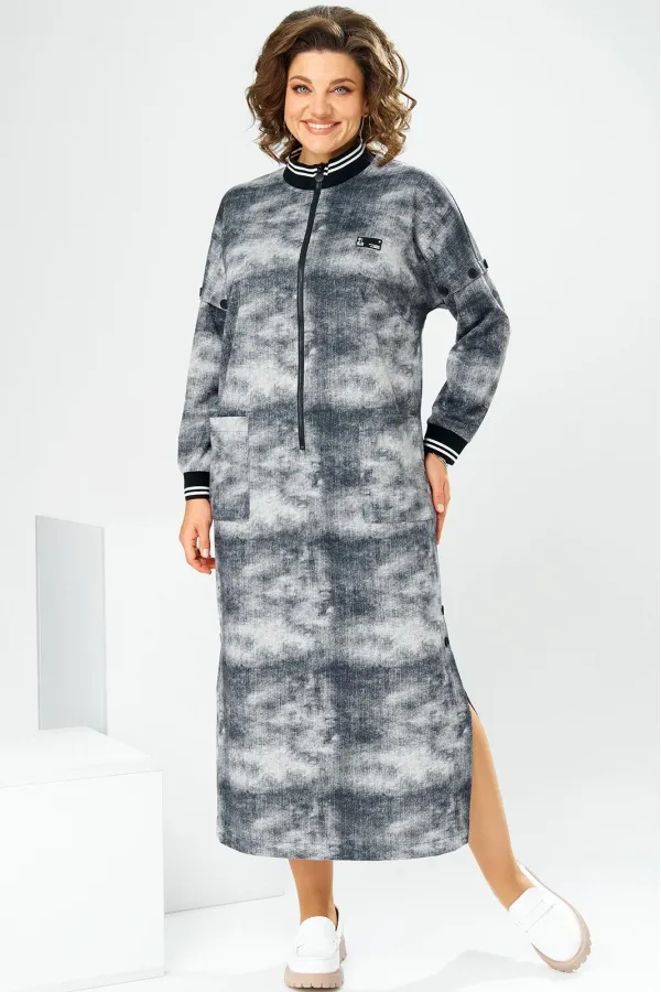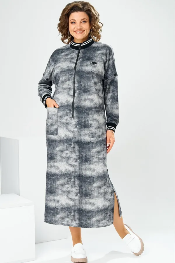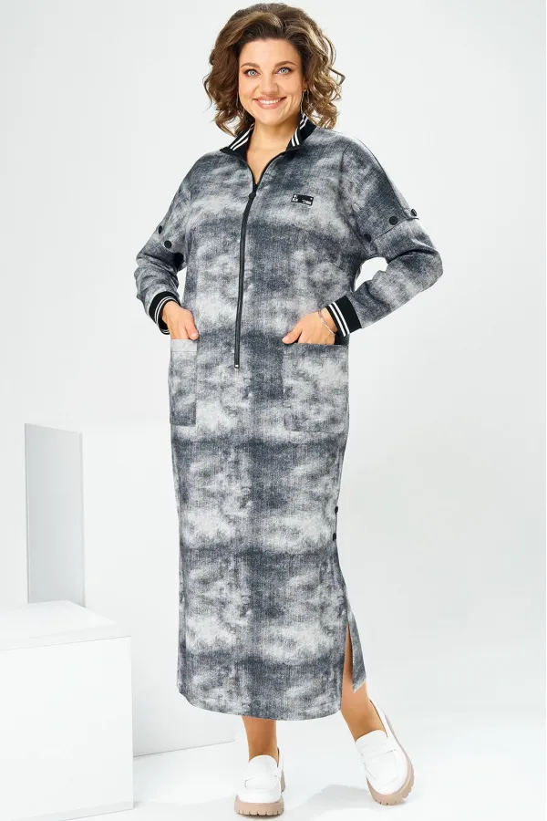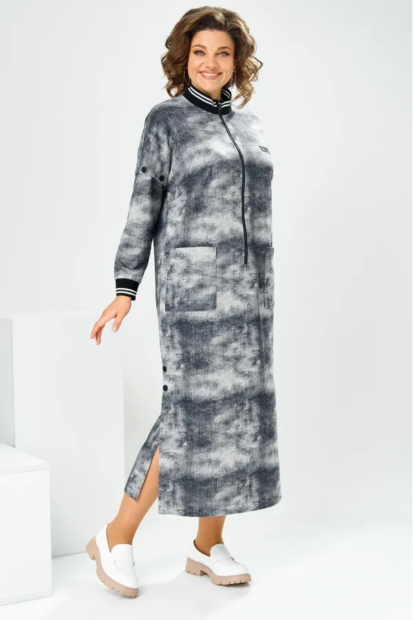 Платье женское, предназначено для повседневной носки. Платье женское прямого силуэта, длиной до нижней части икры. Перед с 2-мя нагрудными выточками с настрочной аппликацией на левой части переда на уровне линии груди, с 2-мя накладными прямоугольными карманами на уровне линии бёдер. Спинка со средним швом и 2-мя таллиевыми вытачками. Боковые швы внизу со шлицами закреплёнными пришивными пуговицами. Горловина круглая с втачной отделочной стойкой. Застёжка на втачную тесьму-молнию по центру переда. Платье с цельнокроенным рукавом с горизонтальным подрезом, с верхней части сформирована цельнокроенная планка, закреплённая на нижней 4-мя пришивными пуговицами. Рукав длинный с притачной отделочной манжетой. Платье без плечевых накладок. Длина спинки платья 127 см, ширина рукава под проймой 22 см.