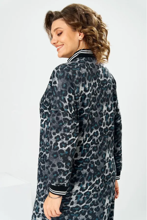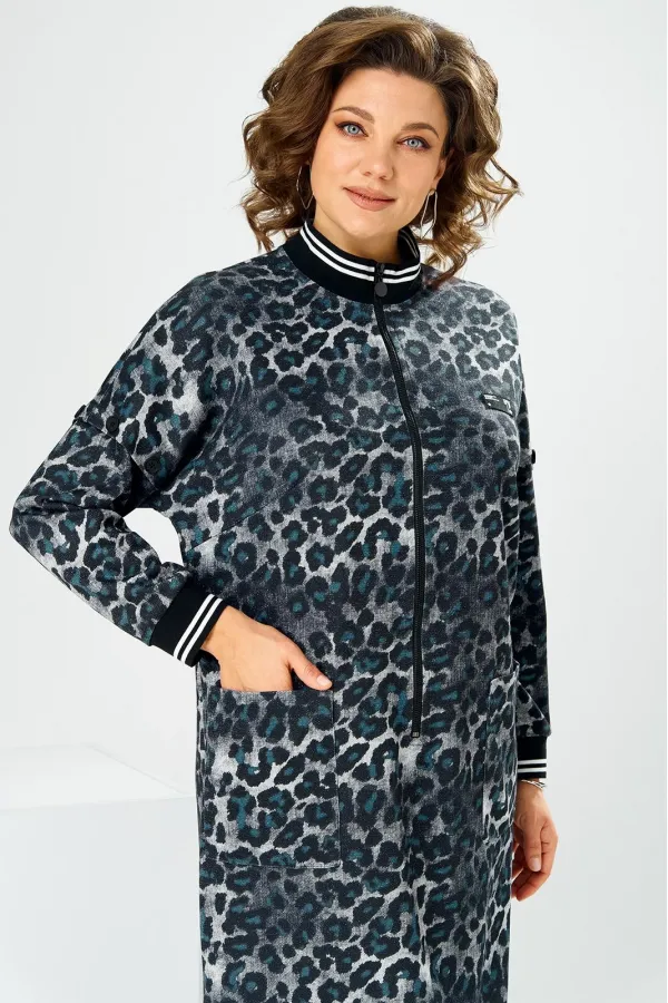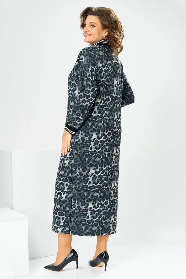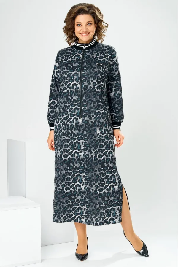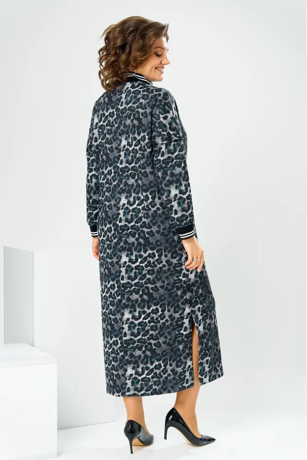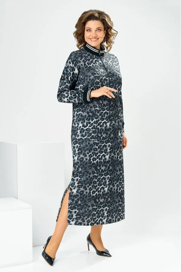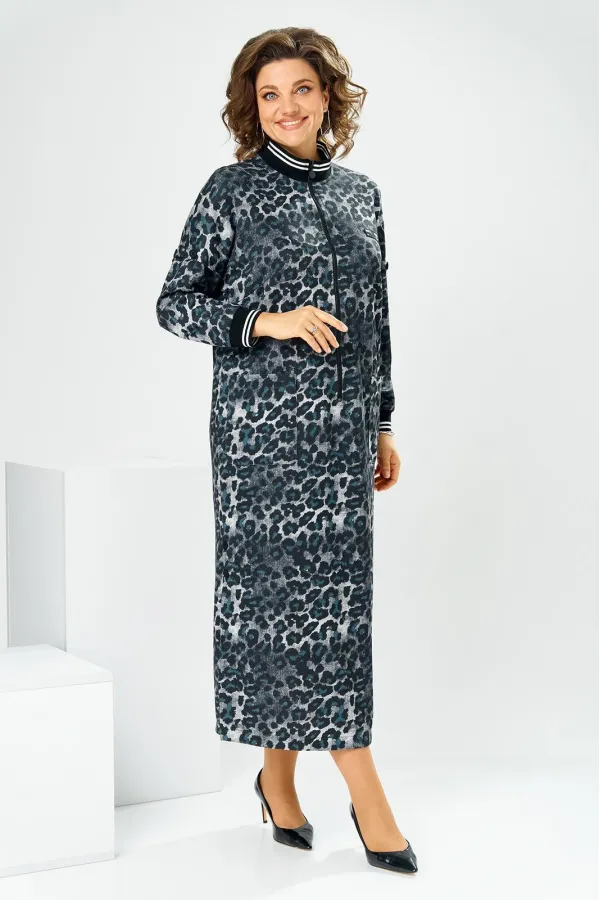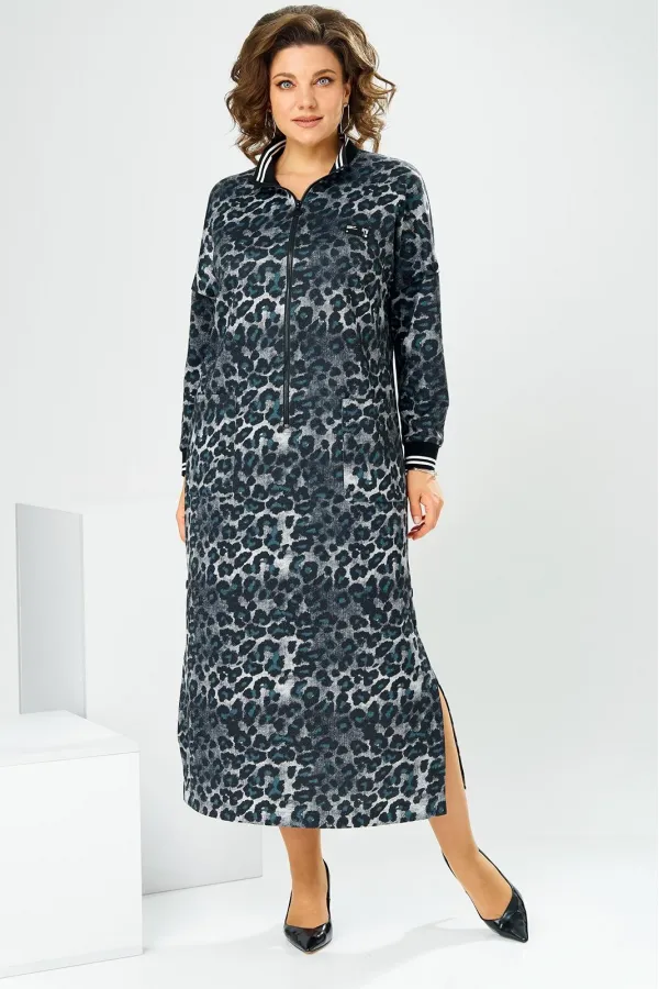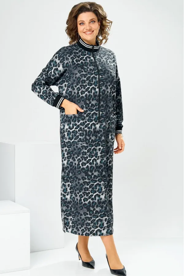 Платье женское, предназначено для повседневной носки. Платье женское прямого силуэта, длиной до нижней части икры. Перед с 2-мя нагрудными выточками с настрочной аппликацией на левой части переда на уровне линии груди, с 2-мя накладными прямоугольными карманами на уровне линии бёдер. Спинка со средним швом и 2-мя таллиевыми вытачками. Боковые швы внизу со шлицами закреплёнными пришивными пуговицами. Горловина круглая с втачной отделочной стойкой. Застёжка на втачную тесьму-молнию по центру переда. Платье с цельнокроенным рукавом с горизонтальным подрезом, с верхней части сформирована цельнокроенная планка, закреплённая на нижней 4-мя пришивными пуговицами. Рукав длинный с притачной отделочной манжетой. Платье без плечевых накладок. Длина спинки платья 127 см, ширина рукава под проймой 22 см.
