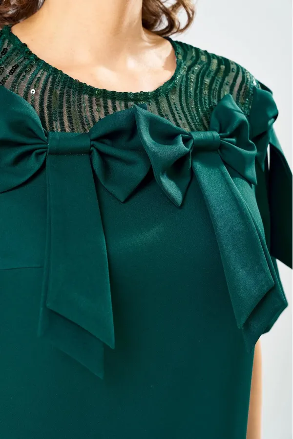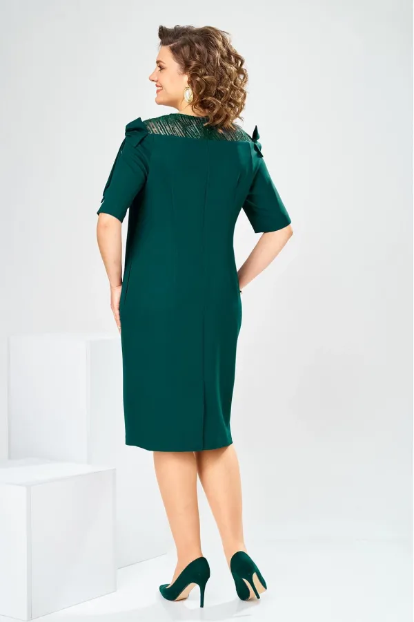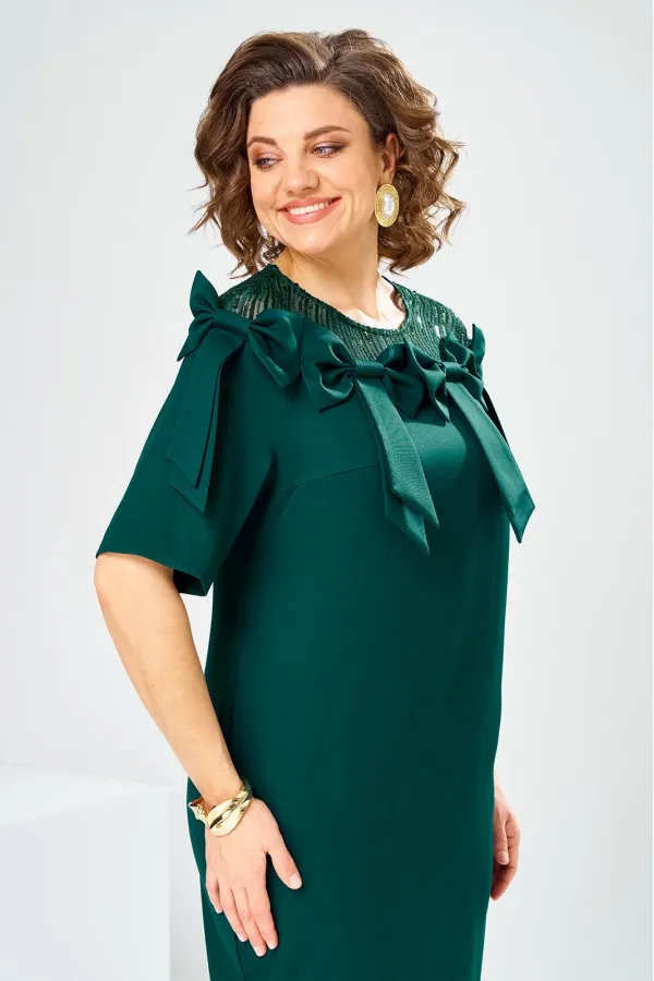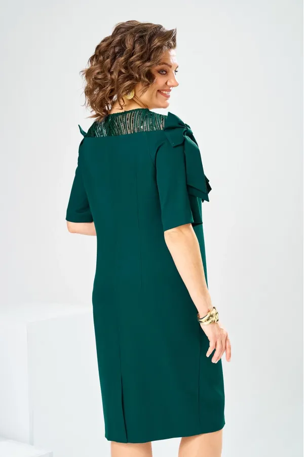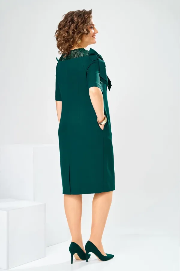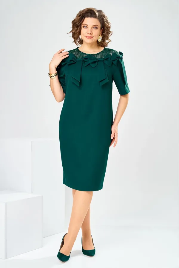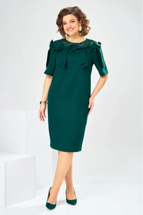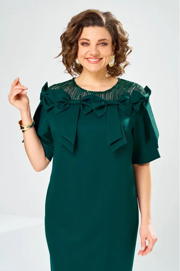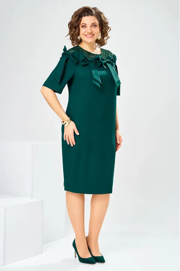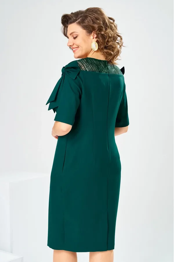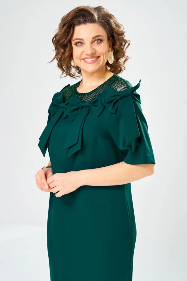 Платье женское относится к нарядной торжественной одежде. Платье женское, полуприлегающего силуэта, длиной за колено. Перед с 2-мя нагрудными вытачками, с отрезной кокеткой и отделочной ткани, переходящей из рукавов. Спинка с отрезной кокеткой из отделочной ткани, переходящей на рукав, с 2-мя таллиевыми вытачками, со средним швом, заканчивающимся шлицей. Горловина круглая, обточная без воротника. Застёжка на потайную тесьму-молнию в среднем шве спинки. Рукав втачной, одно шовный, длиной до локтя. Перед плятья по шву притачивания кокетки декорирован 4-мя настрочными бантами. Боковые швы с карманами. Платье без плечевых накладок. Длина платья по спинке 102 см, длина рукава 27 см.