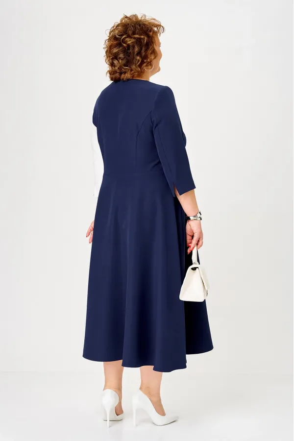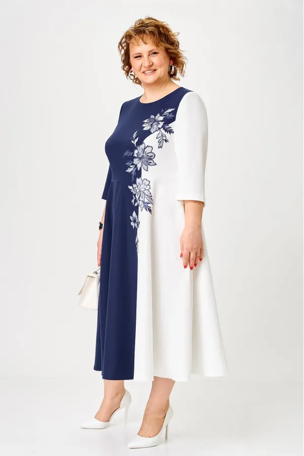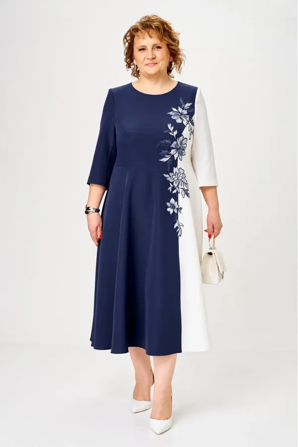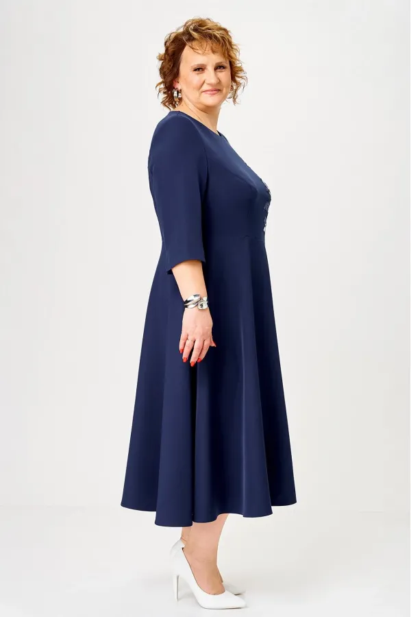 Платье женское, относится к торжественной, нарядной одежде. Платье женское, отрезное по линии талии, расширенное к низу, длиной до середины икры. Верхняя часть переда с 2-мя отрезными бочками, левый из отделочной ткани; нижняя часть переда с отрезным бочком с левой стороны из отделочной ткани. Шов соединения бочков из отделочной ткани с передом декорирован настрочной аппликацией. Верхняя часть спинки с 2-мя отрезными бочками из отделочной ткани, нижняя часть спинки с 1-ним отрезным бочком из отделочной ткани слева. Горлловина круглая, обточная, без воротника. Застёжка на потайную тесьму-молнию в левом боковом шве платья. Рукав втачной 2-х шовный, длиной 3/4, локтевой шов внизу с разрезом. Левой рукав из отделочной ткани. Платье с плечевыми накладками. Длина спинки платья 118 см. Длина рукава 44,5 см.