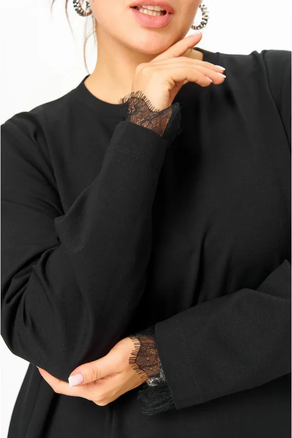 Эффектное платье выполнено из трикотажного полотна. Платье свободного трапециевидного силуэта, длиной макси. Рукав втачной длинный с манжеткой из кружева. В боковых швах имеются функциональные карманы. Низ платья оформлен кружевным воланом. Длинный фасон дает возможность создания стильного образа. Если немножко пофантазировать с обувью получится много стильных и интересных вариантов образа.