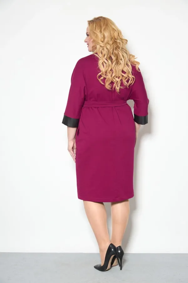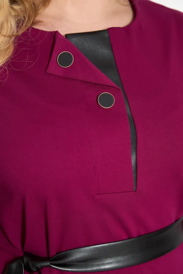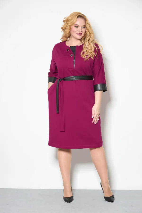 Платье свободного кроя со спущенным рукавом 3/4, длинной чуть ниже колена. По низу рукава - манжет из отделочной ткани- искусственной кожи . По переду планка с небольшим отворотом и декоративными пуговицами, нижняя планка из отделочной кожи. К платью прилагается съемний пояс. состоящий из основной ткани и кожи.
