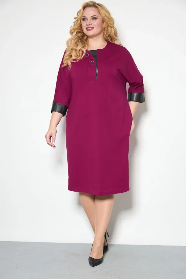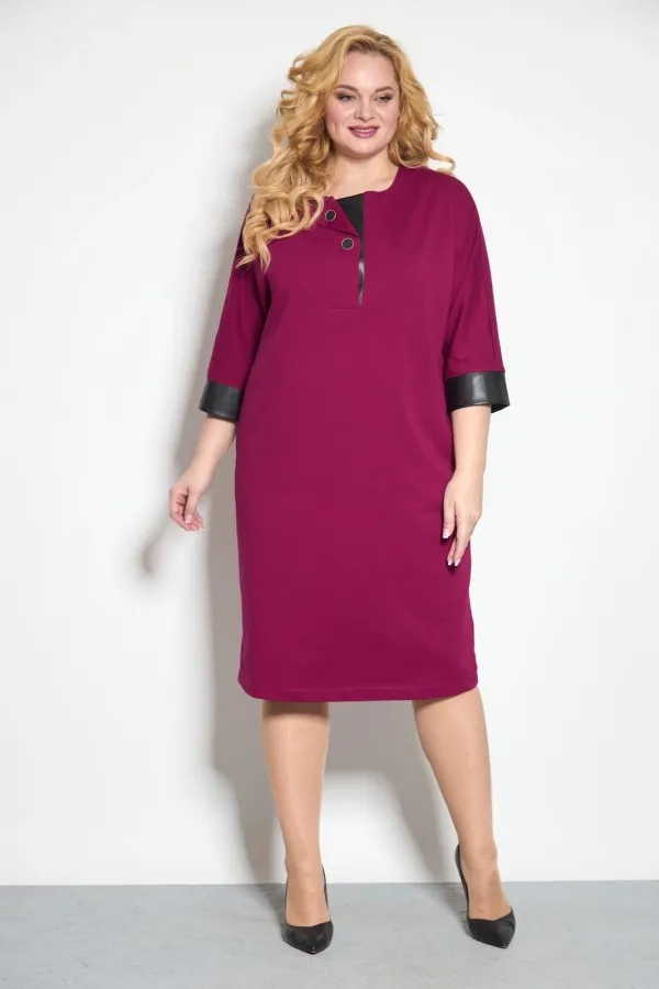 Платье свободного кроя со спущенным рукавом 3/4, длинной чуть ниже колена. По низу рукава - манжет из отделочной ткани- искусственной кожи . По переду планка с небольшим отворотом и декоративными пуговицами, нижняя планк... Читать далее...