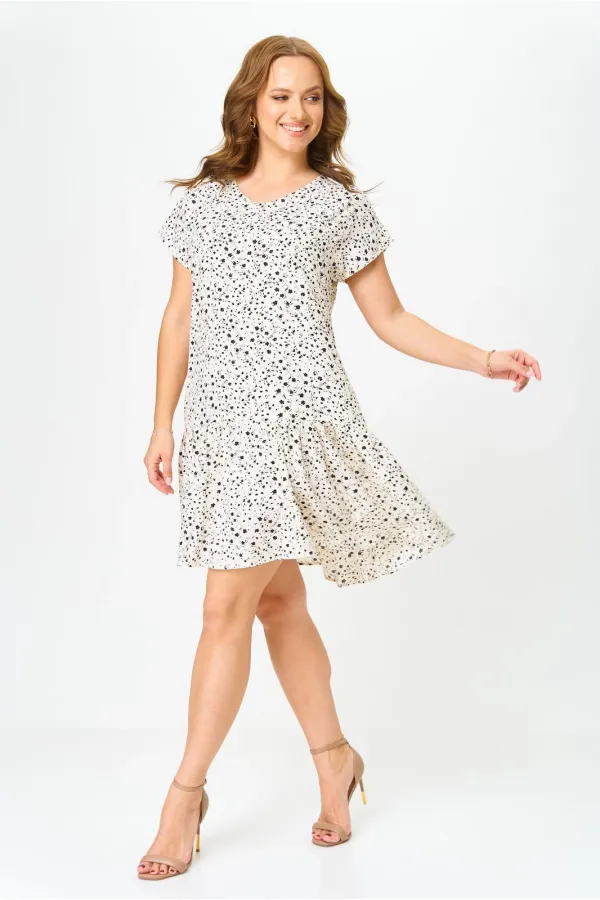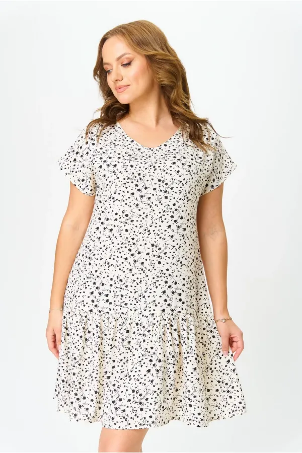 Легкое платье с v-образным вырезом , свободного кроя ,с коротким рукавом, по низу платья волан со сборкой ,длинною выше колен.