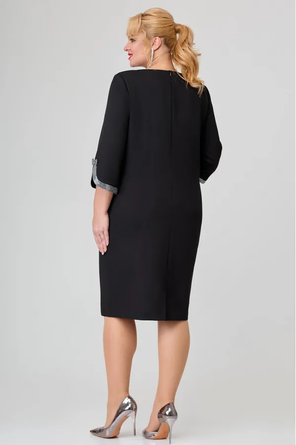 Элегантное платье полуприлегающего силуэта из текстильной ткани, длиной чуть ниже колена. Перед c V – образной вставкой из отделочной ткани. Вырез горловины фигурный. В боковых швах карманы. Рукав длиной 3/4, втачной, с фигурным низом и элементами из отделочной ткани. В среднем шве спинки потайная молния и разрез. Платье станет идеальным вариантом к любому случаю.