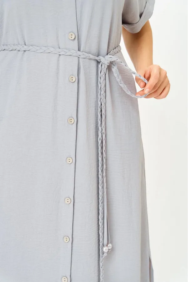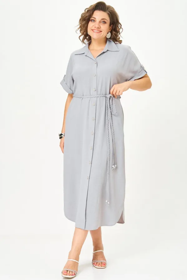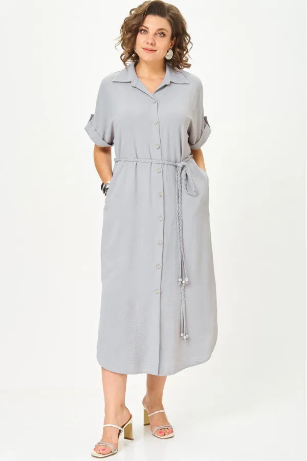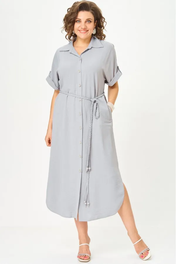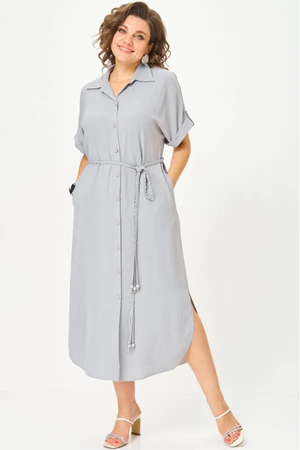 Платье женское прямого силуэта со спущенной линией плеча. Застежка центральная на 8 петель и пуговиц. Воротник отложной на стойке. По верхней части спинки кокетка, нижняя часть спинки со встречной складкой. В боковых швах карманы. По линии талии пояс в тон ткани. Низ рукава с манжетой и декоративной патой. Платье с фигурной линией низа и разрезами.