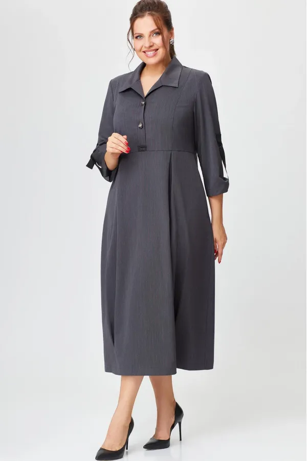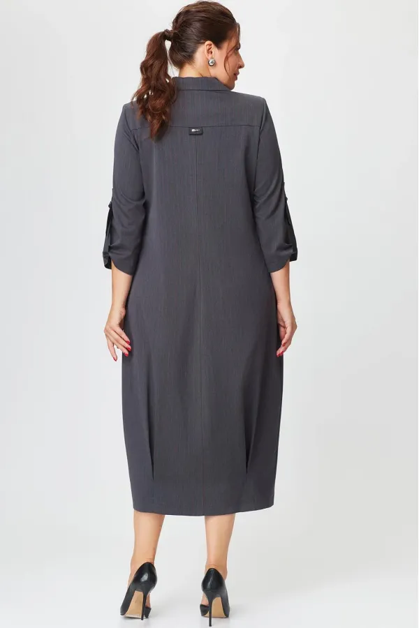 Платье женское прямого силуэта. По переду платья нагрудные вытачки. По переду в верхней части платья рельефы и застежка на две петли и пуговицы, по шву притачивания складки. По горловине отложной воротник. Спинка с кокеткой и средним швом. В боковых швах обработаны карманы. По низу платья застрочены складки для создания О-образной формы. Рукав втачной, с декоративной патой из отделочной ткани.