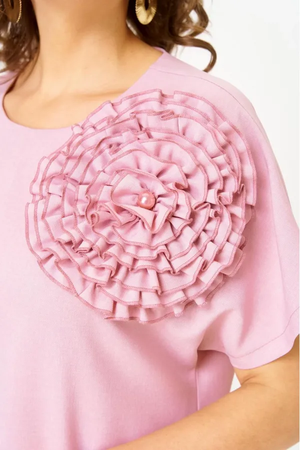 Платье женское прямого кроя, с коротким цельнокроеным рукавом. Вырез горловины округлой формы. В среднем шве спинки застежка молния. В боковых швах обработаны карманы и разрезы. В комплекте с платьем съемное украшение в виде цветка.