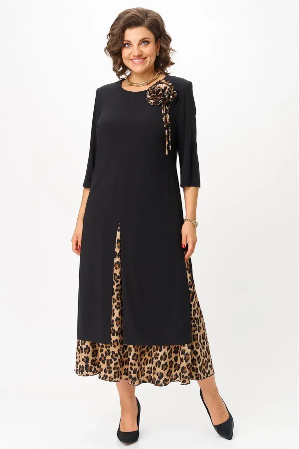Платье женское полуприлегающего силуэта расширенное к низу, выполнено в комплектации из двух предметов. Верхнее платье – из мягкого эластичного материала, с высокими разрезами по переду, спинке и бокам, с втачным рукавом ¾. По линии груди вытачки. По левой части переда съемный цветок.
