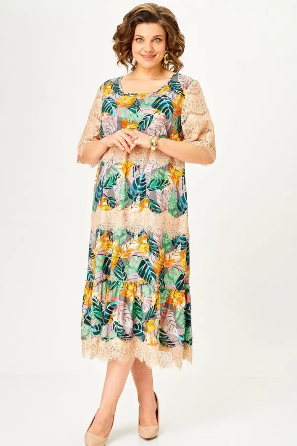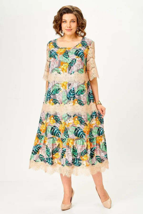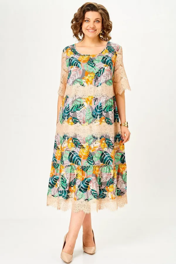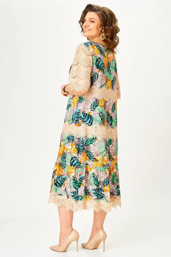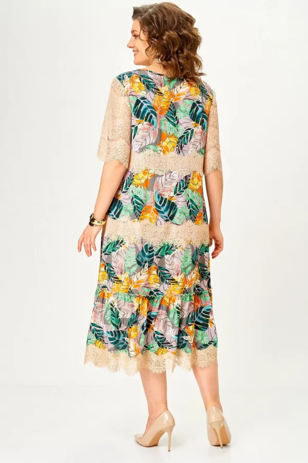 Платье женское А – силуэта с втачным рукавом. По линии груди переда вытачки. По низу платья широкая отделочная деталь со сборкой. Рукава платья выполнены из кружева. Низ платья и каждый ярус декорированы кружевом.