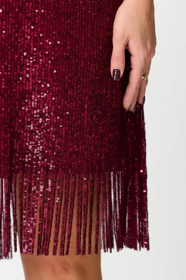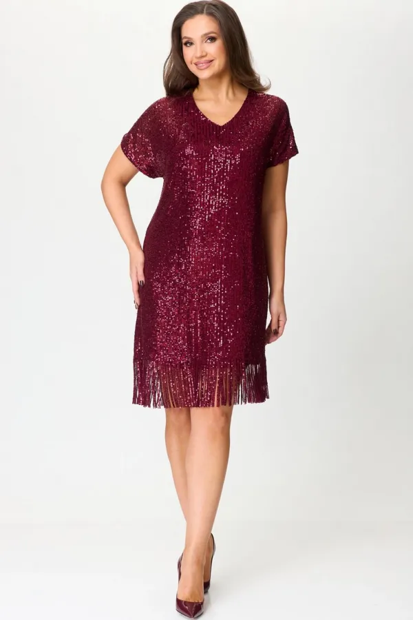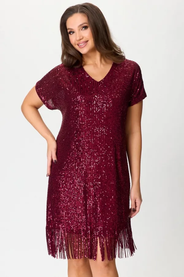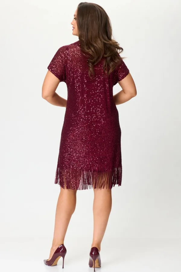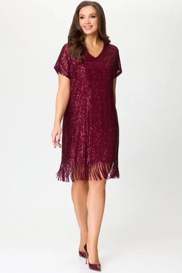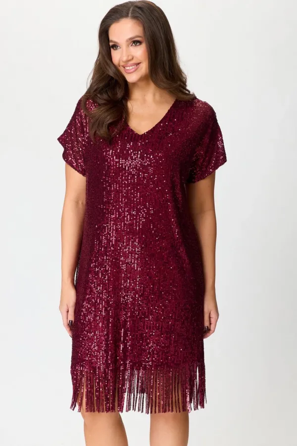 Платье нарядное с пайетками и бахромой прямого кроя, выполнено в комплектации из двух предметов. Линия плеча спущена. Вырез горловины v-образный. Нижнее платье полуприлегающего силуэта, на регулируемых бретелях. По линии груди вытачки.