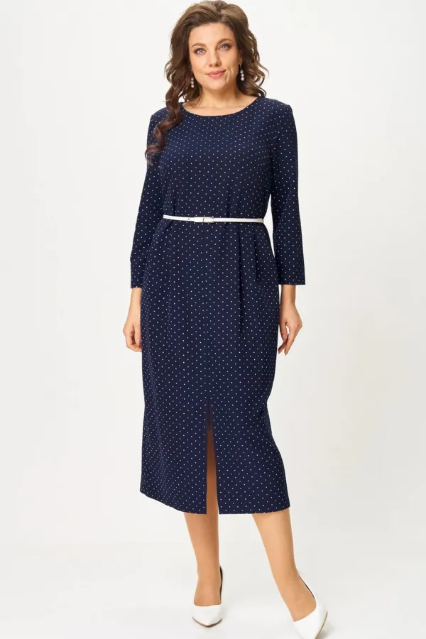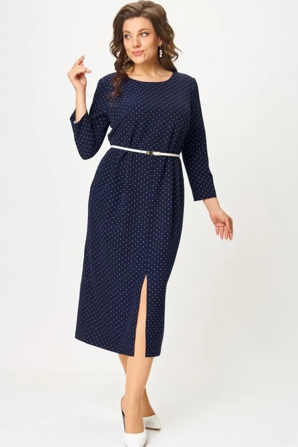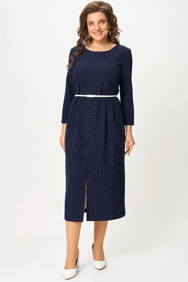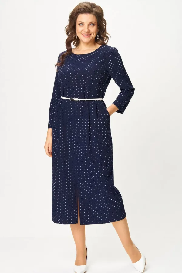 Платье женское полуприлегающего силуэта с втачным рукавом. Перед платья с горизонтальным швом по талии. Верхняя часть с вытачками по линии груди, нижняя часть со складками в области талии и карманами что обеспечивает прекрасную посадку и подчеркивает фигуру. Разрез по переду платья добавляет нотку игривости и удобства. В комплекте съемный ремень.