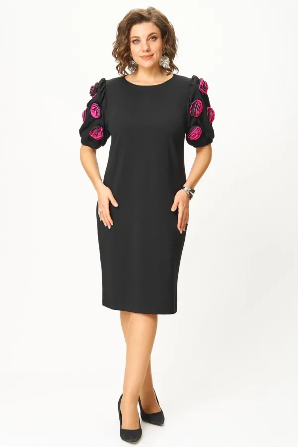 Платье женское полуприлегающего силуэта выполнено из трикотажного полотна с втачным рукавом на подкладке. Горловина округлой формы. По переду расположены нагрудные вытачки. Спинка платья со средним швом с застежкой на петлю и пуговицу и разрезом по низу. Рукав короткий со сборкой по окату и низу рукава. Особенный акцент платья декоративные цветы, из отделочной ткани, добавляющие объем и изюминку.