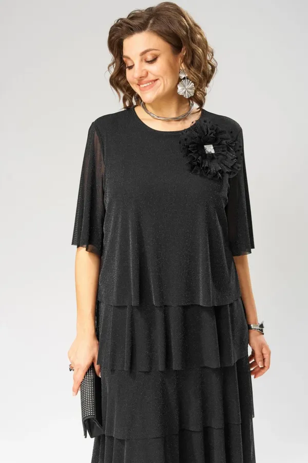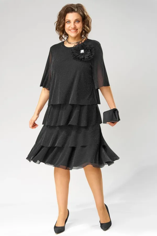 Платье женское свободного А-силуэта выполнено на подкладке из трикотажной ткани, с втачным рукавом. Горловина округлой формы. Верхняя часть платья отлетная, что придает изысканность платью. По переду расположены нагрудные вытачки, по спинке застежка на петлю и пуговицу в форме капельки, обеспечивающей идеальную посадку. Особенный акцент платья – это три ряда воланов по низу, добавляющие объем и изюминку. Нижний край воланов и рукавов не обработан.