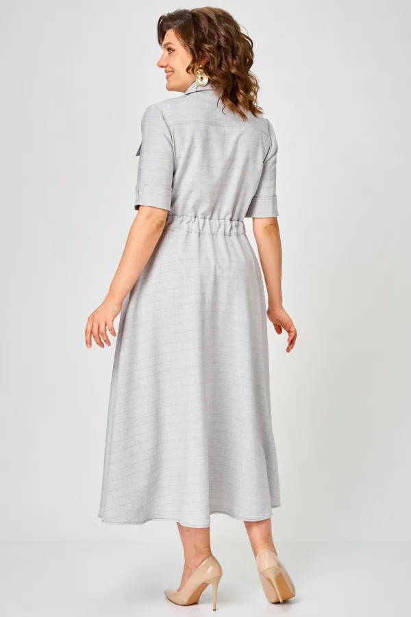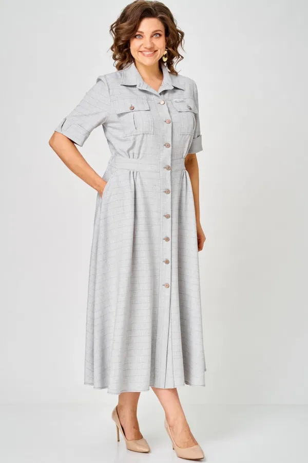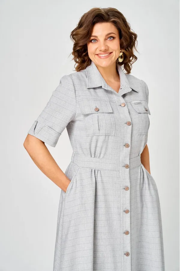 Платье женское полуприлегающего силуэта, отрезное по талии с расклешенной юбкой. По переду центральная планка с застежкой на петли и пуговицы. По горловине отложной воротник на стойке. По переду в верхней части карманы с клапаном. По спинке кокетка. Рукав втачной длиной ¾ с отложной манжетой. По талии со стороны спинки резинка для удобства посадки.