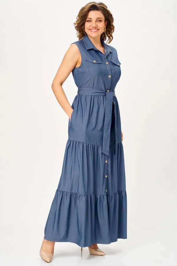 Платье женское с расширением по низу. Платье отрезное по линии талии. Верхняя часть с накладными карманами с клапаном. По линии груди вытачки. Спинка с кокеткой. Нижняя часть платья с двумя рядами оборки. Застежка центральная на петли и пуговицы. По горловине воротник на стойке. По линии груди вытачки. В комплекте пояс из основной ткани.