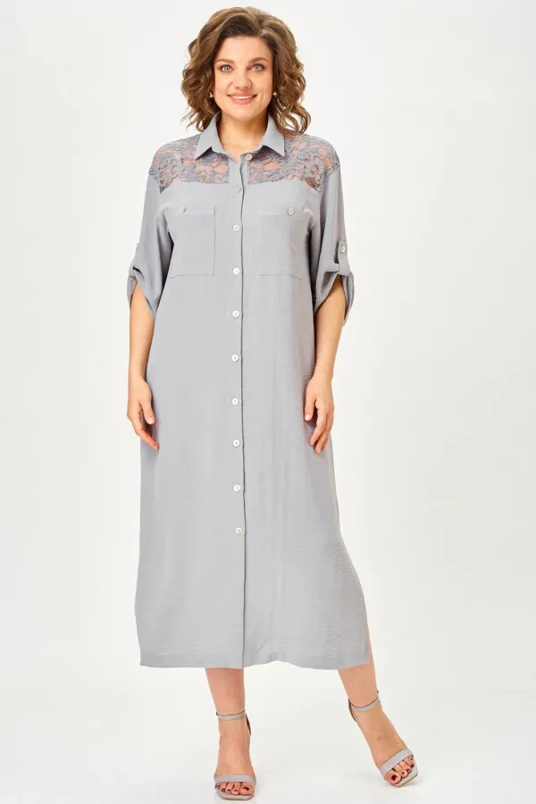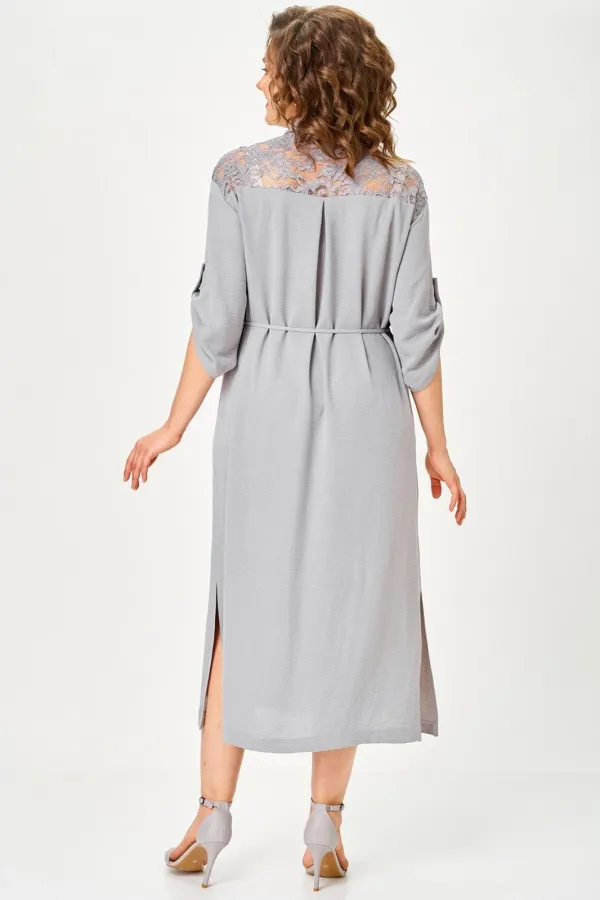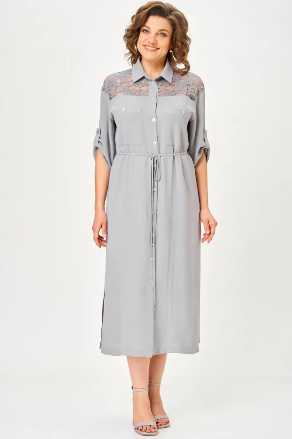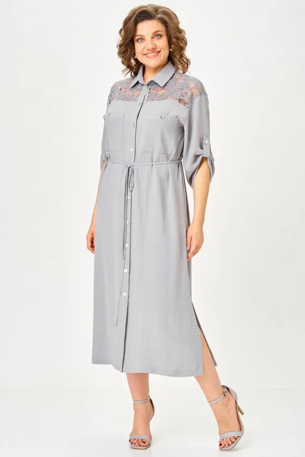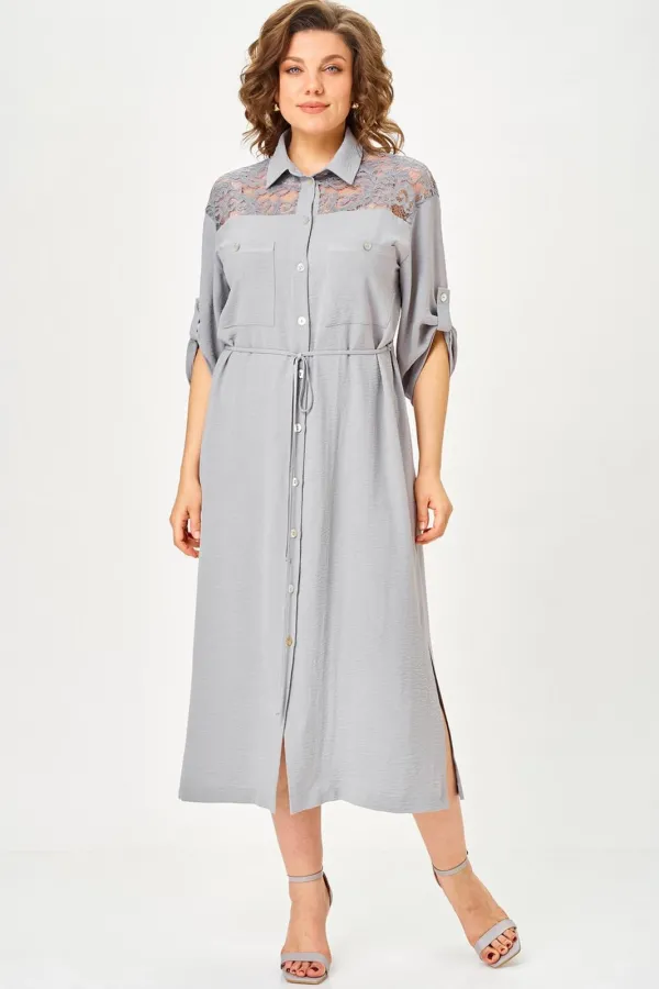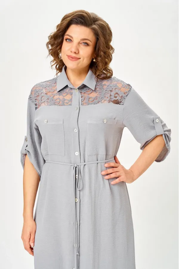 Платье женское в стиле сафари прямого силуэта с декором из кружева. Втачные рукава длиной ¾, по низу регулируются патой. Линия плеча спущена. Застежка центральная на петли и пуговицы. Воротник отложной на стойке. Нижняя часть спинки со складкой из-под кокетки. Верхняя часть переда с накладными карманами. В боковых швах разрезы. По линии талии съемный пояс в тон.