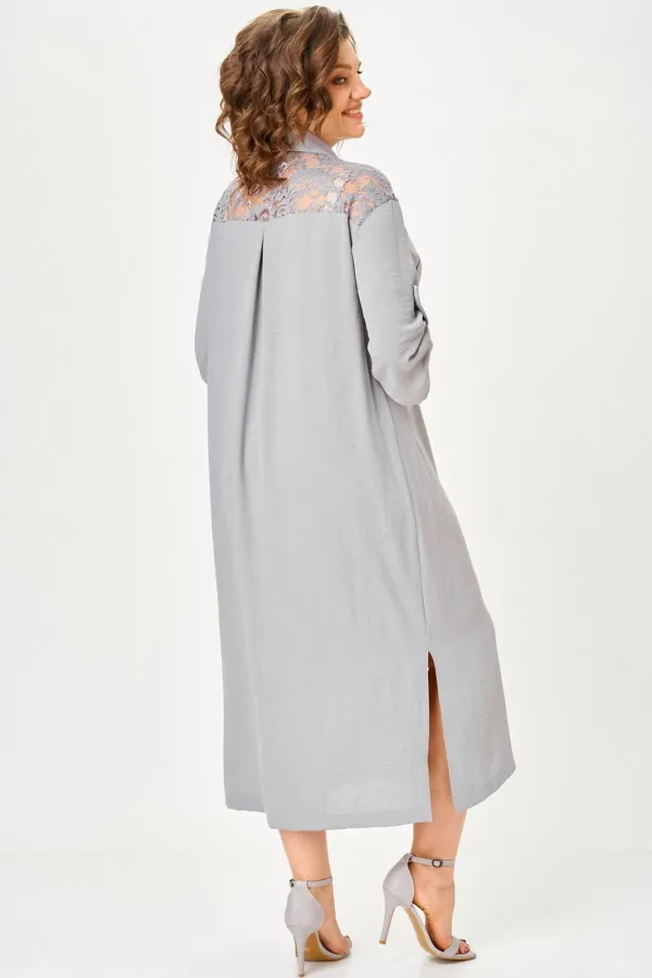 Платье женское в стиле сафари прямого силуэта с декором из кружева. Втачные рукава длиной ¾, по низу регулируются патой. Линия плеча спущена. Застежка центральная на петли и пуговицы. Воротник отложной на стойке. Нижняя ... Читать далее...