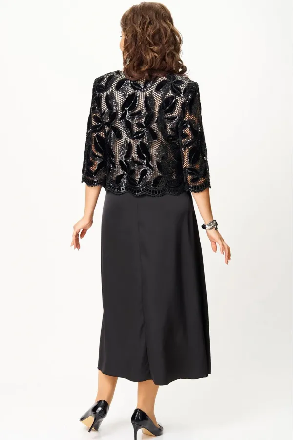 Платье женское полуприлегающего силуэта с расширением понизу. Платье выполнено как имитация комплекта. Верхняя часть платья из кружева на трикотажной подкладке, нижняя часть из атласа «Армани». По линии груди вытачки. Втачные рукава длиной ¾, добавляют романтичности и легкости. Такое платье отлично подойдет как для вечернего выхода, так и для более формальных событий.