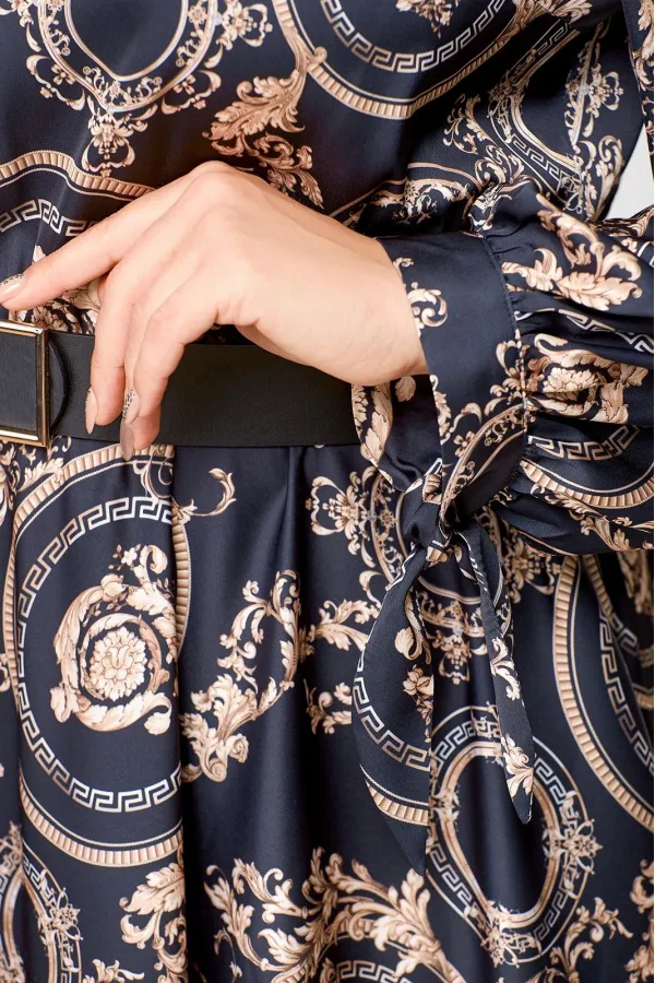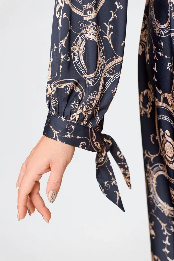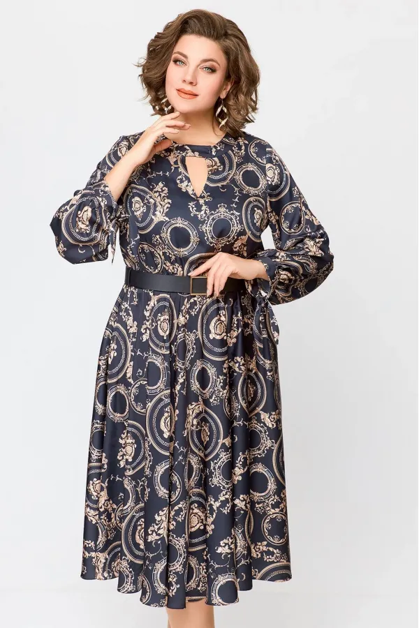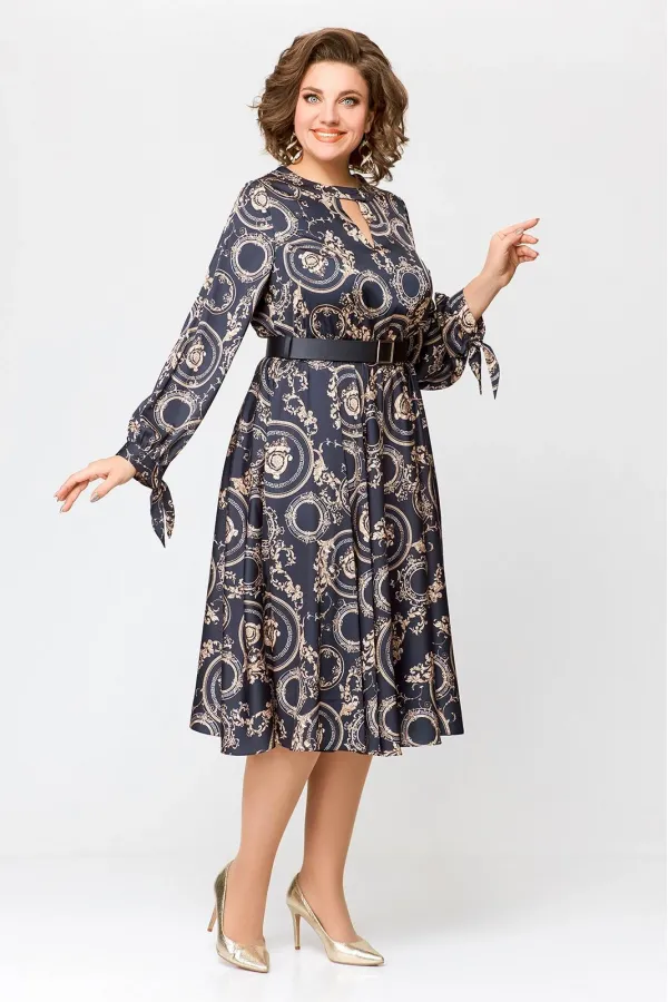 Платье из искусственного шёлка Х-образного силуэта, отрезное по линии талии. По переду лифа обработаны нагрудные вытачки, удлинённый V-образный вырез и отрезанная декоративная кокетка с застёжкой на кнопку. Спинка лифа цельнокроеная. Юбка расклешённая с карманами в боковых швах. Рукав втачной, одношовный со сборкой по шву притачивания манжеты. По низу рукава обработана манжета с завязками.