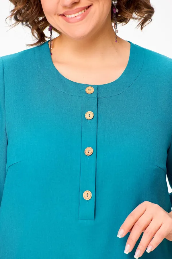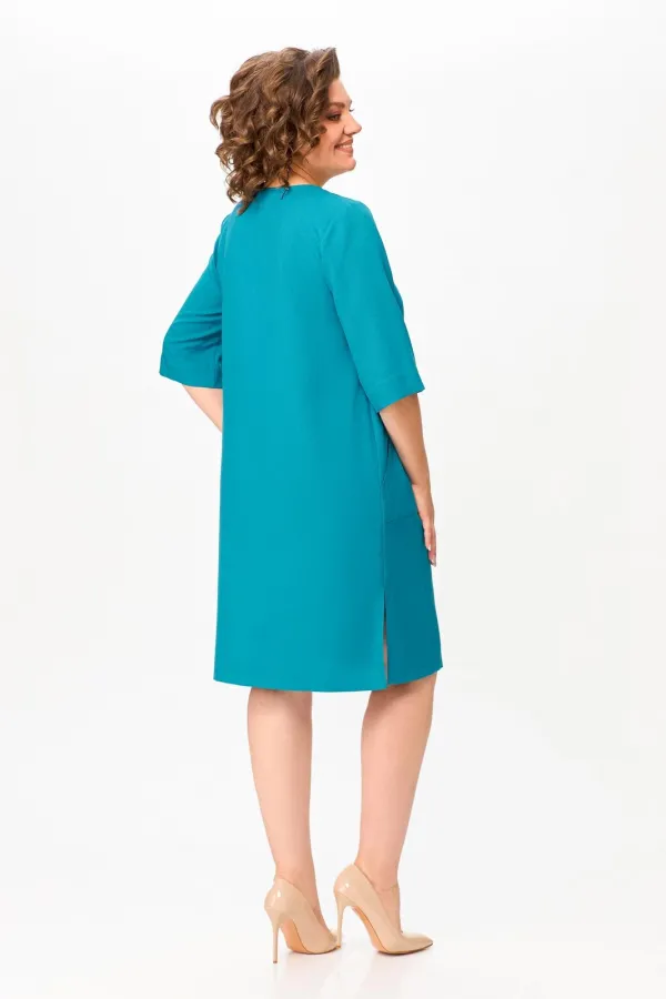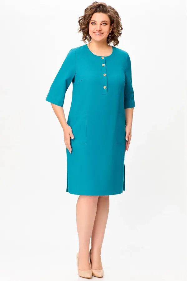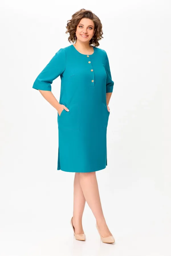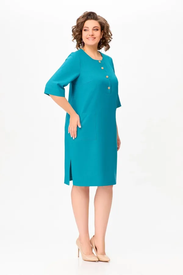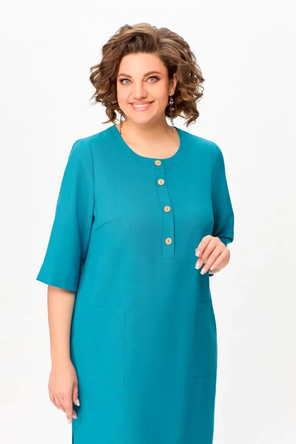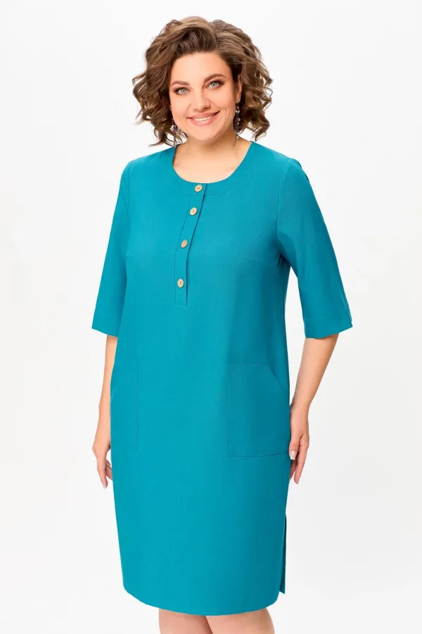 Платье прямого силуэта из вискозно-льняной ткани, полочка с планкой , застегивающейся на петли и декоративные пуговицы, с нагрудными выточками и накладными фигурными карманами в области бёдер, горловина круглая, обработана притачной обтачкой, рукав втачной, одношовный, длиной ниже локтя. В боковых швах разрезы длиной 20 см.