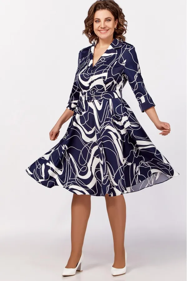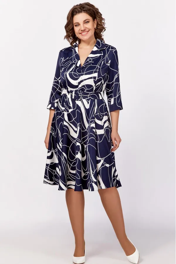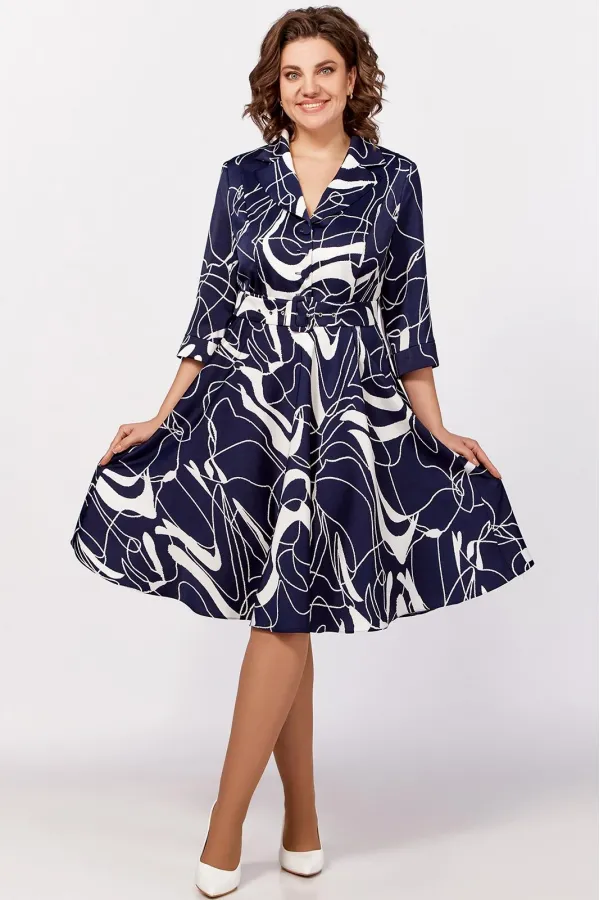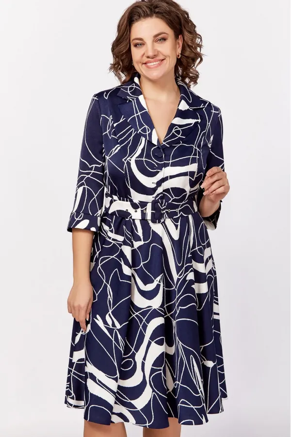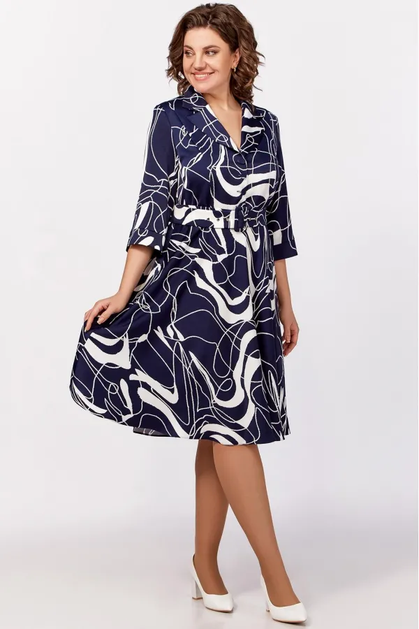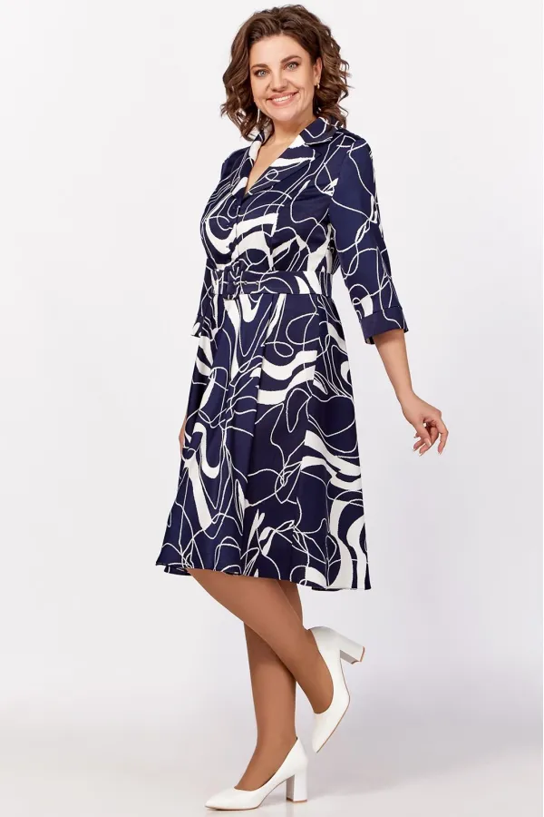 Платье из мягкой вискозной ткани, Х-образного силуэта с полуприлегающим лифом. Платье отрезное по линии талии. Перед лифа с вертикальными рельефами и застёжкой на петли и 4 пуговицы, обтянутые основной тканью. Горловина V-образной формы, с отложными лацканами и воротником пиджачного типа. Спинка лифа с талиевыми выточками. Рукав втачной, длиной ¾, по низу манжет с разрезом. Застёжка в боковом шве на потайную тесьму молнию. В комплекте пояс из основной ткани с пряжкой.