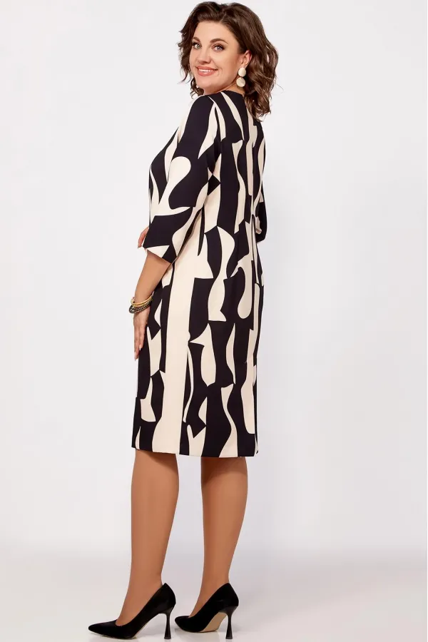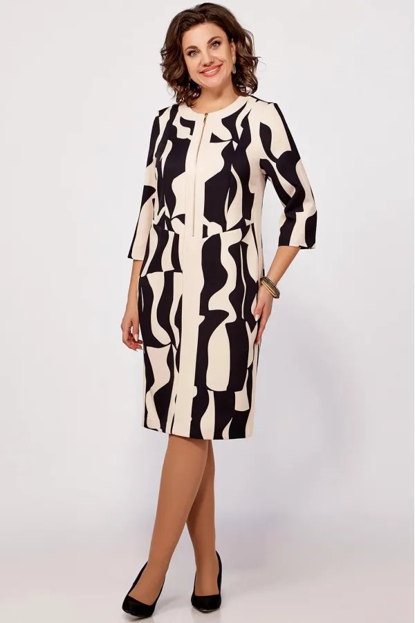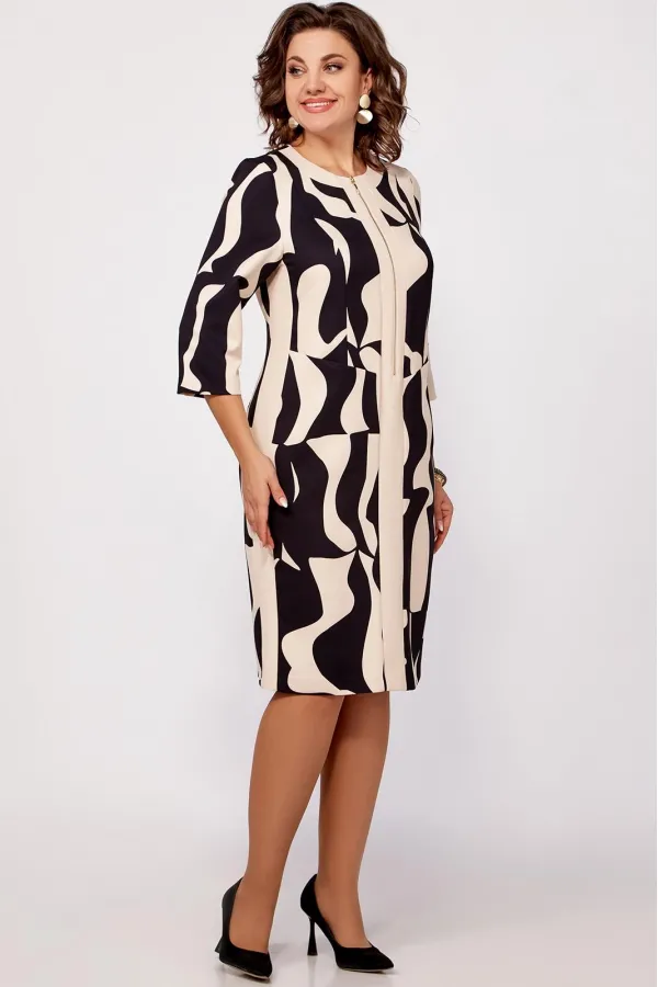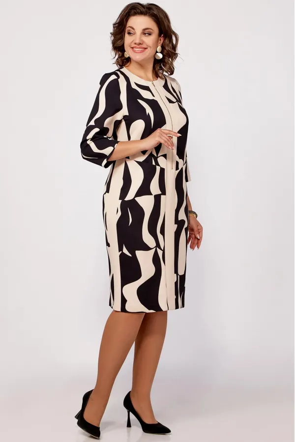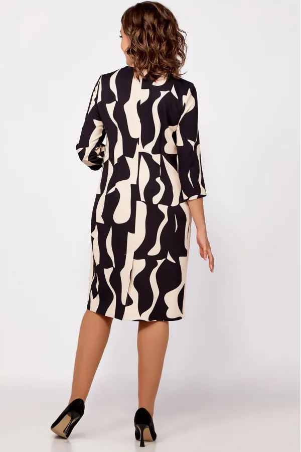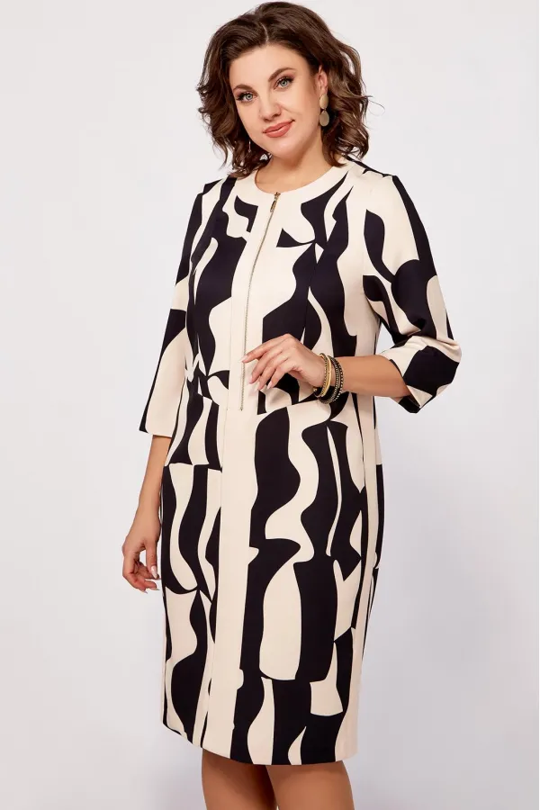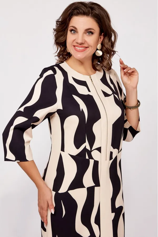 Платье полуприлегающего силуэта из поливискозной ткани, выполнено в комбинации расцветки в принт и однотон. Спереди, по центру планка из однотонной ткани переходящая в отделку горловины. В верхней части планки металлическая молния, длиной 40 см. По бокам вставки из однотонной ткани.
