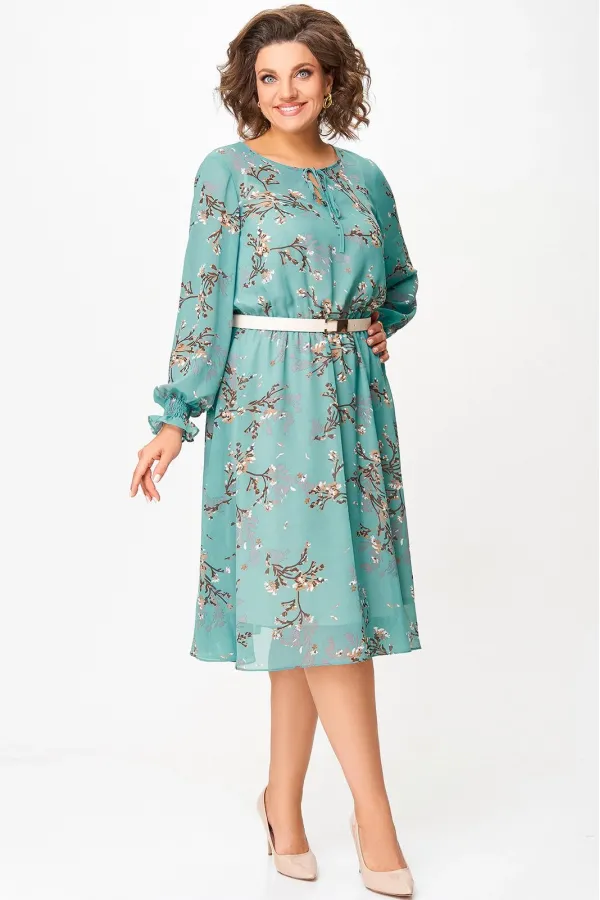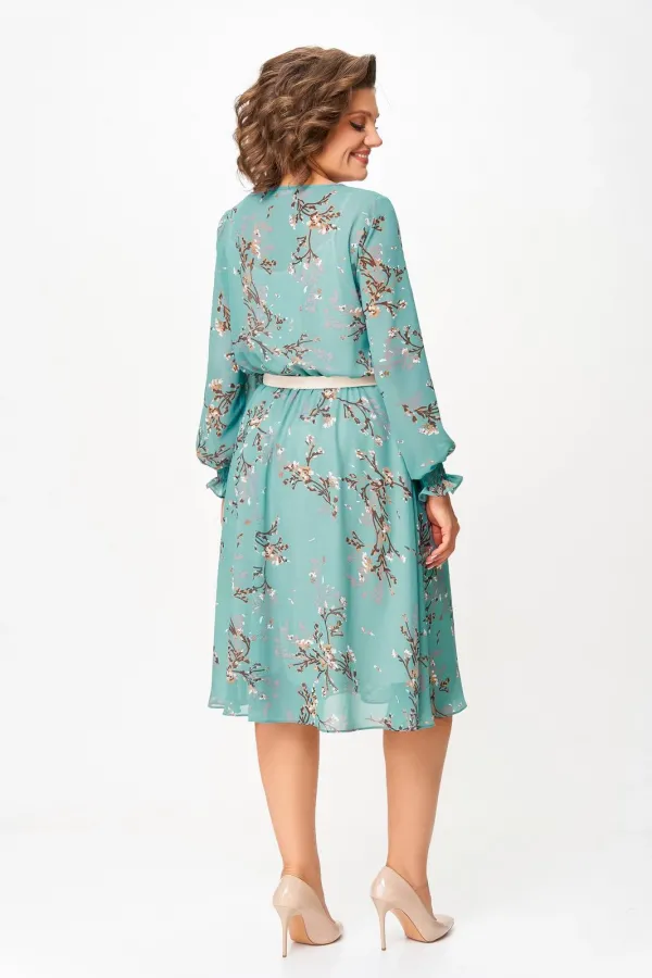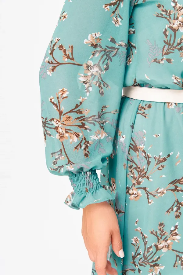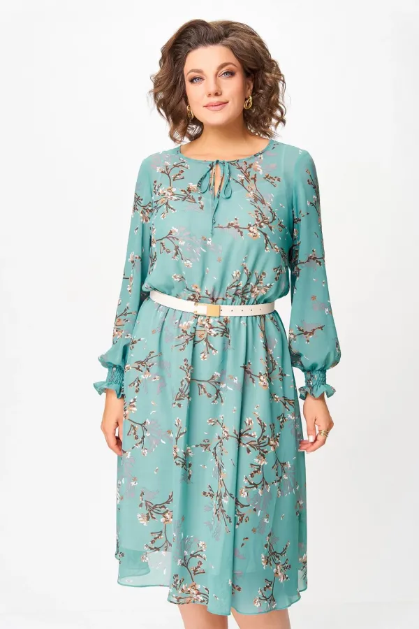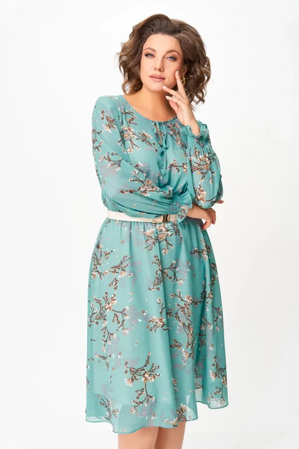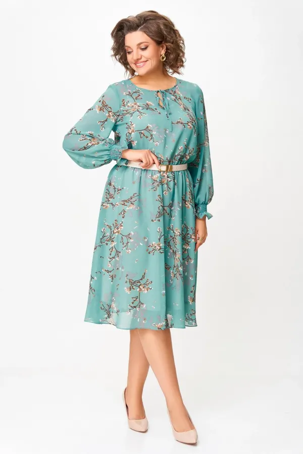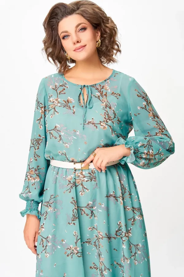 Платье длиной миди, выполнено из шифона на трикотажной подкладке. Лиф отрезной по линии талии. Талия регулируется эластичной тесьмой (резинкой). Нижняя часть платья А-силуэта. Подкладка верхней части платья на бретелях. Рукав втачной длинный, в нижней части собран на эластичные строчки, которые внизу образуют рюшу . Горловина округлой формы, по центру переда капелька с завязкой.
