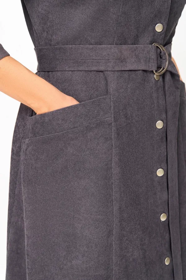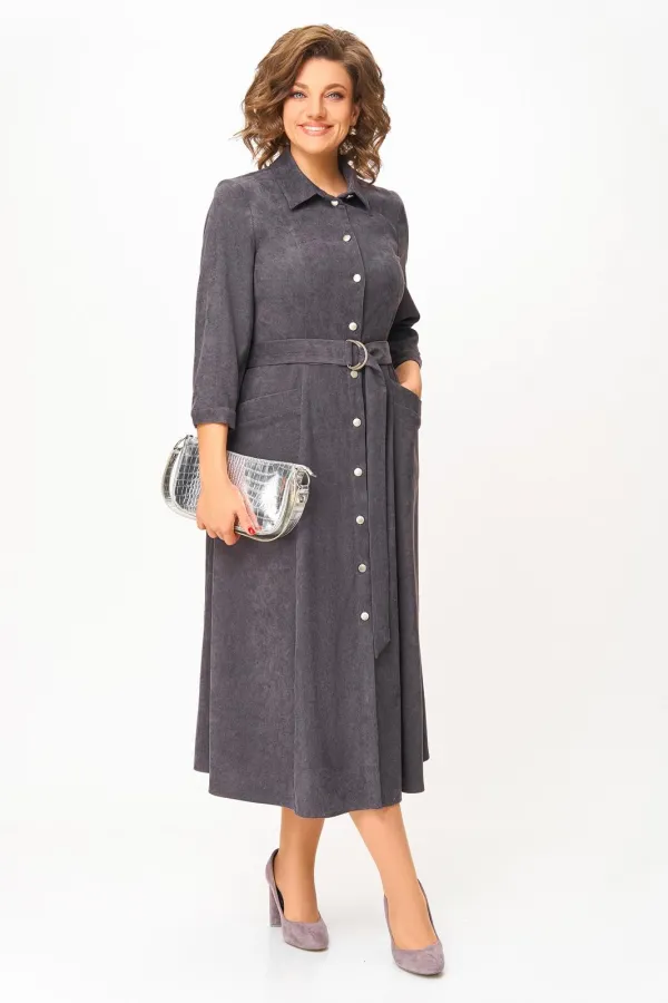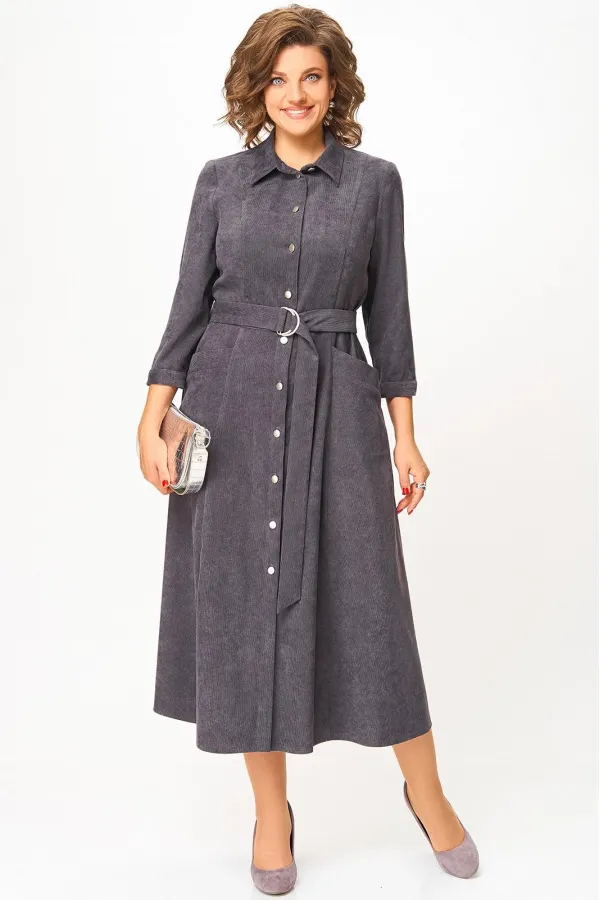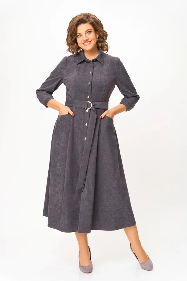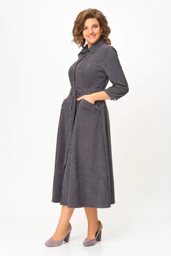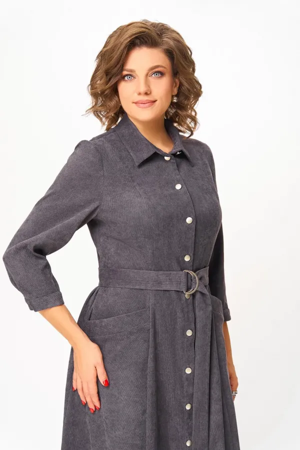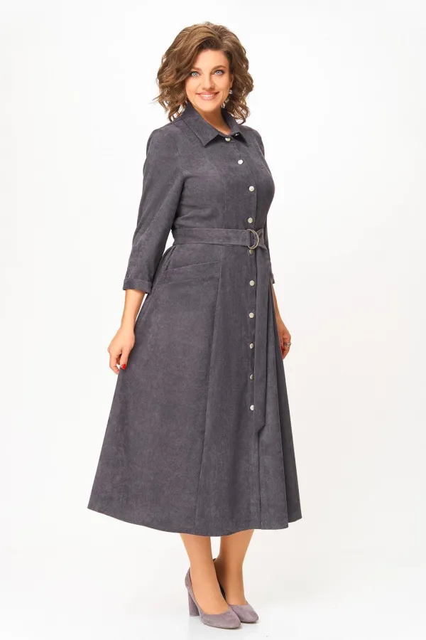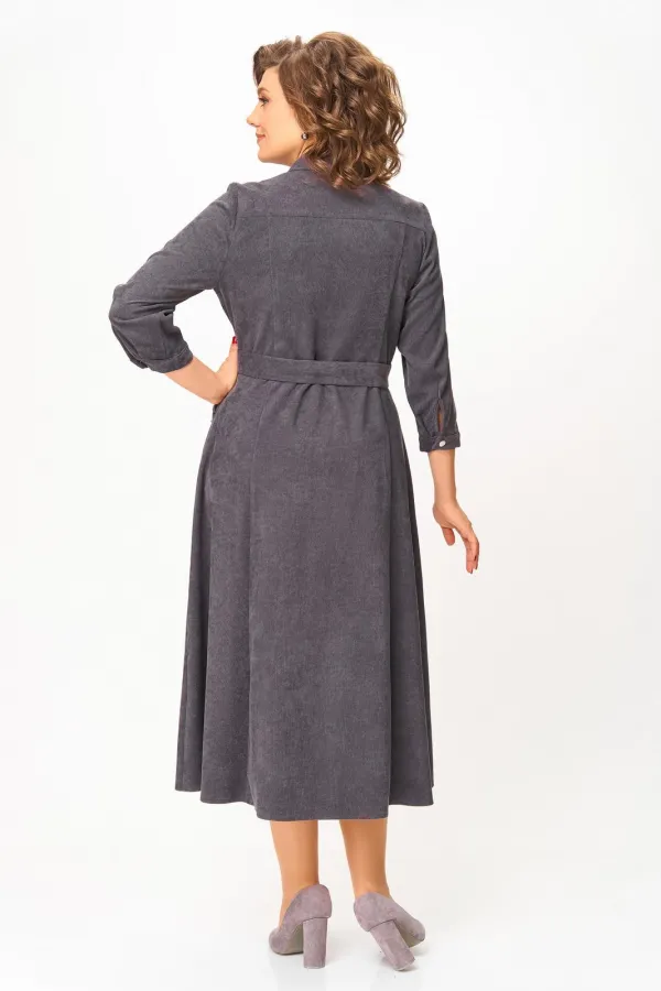 Платье из мягкой ткани вельвет, отрезное по линии талии с полуприлегающим лифом и юбкой А-силуэта, с центральной застёжкой на петли и декоративные пуговицы.