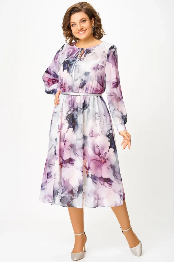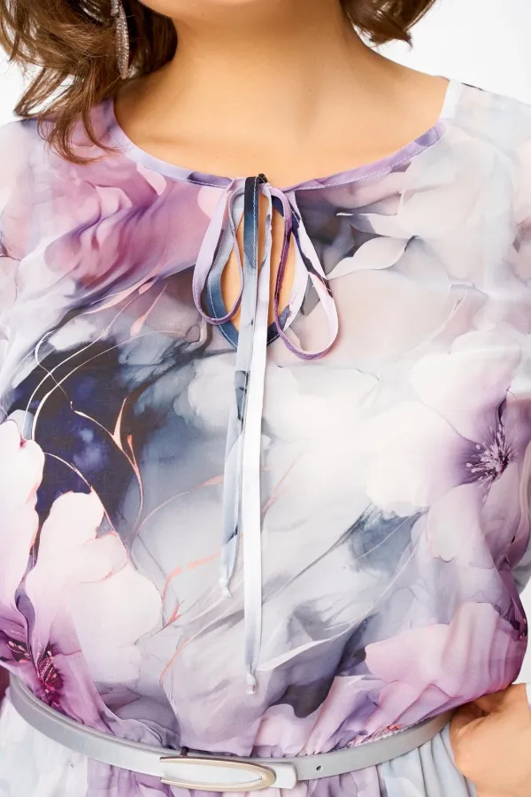 Платье из воздушной шифоновой ткани, на трикотажной подкладке, отрезное по линии талии, шов собран на эластичную тесьму-резинку. Горловина округлой формы, по переду капелька с завязкой. Рукав втачной одношовный, внизу со сборкой и манжетой, которая застёгивается на 2 петли и пуговицы.