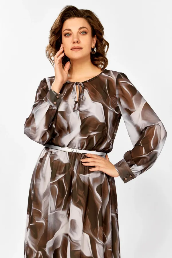 Платье из воздушной шифоновой ткани, на трикотажной подкладке, отрезное по линии талии, шов собран на эластичную тесьму-резинку. Горловина округлой формы, по переду капелька с завязкой. Рукав втачной одношовный, внизу со сборкой и манжетой, которая застёгивается на 2 петли и пуговицы.