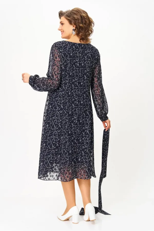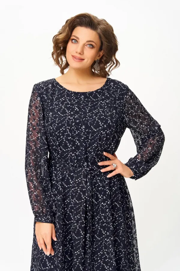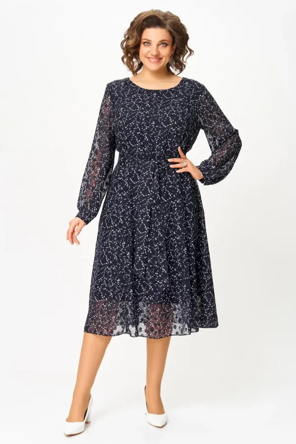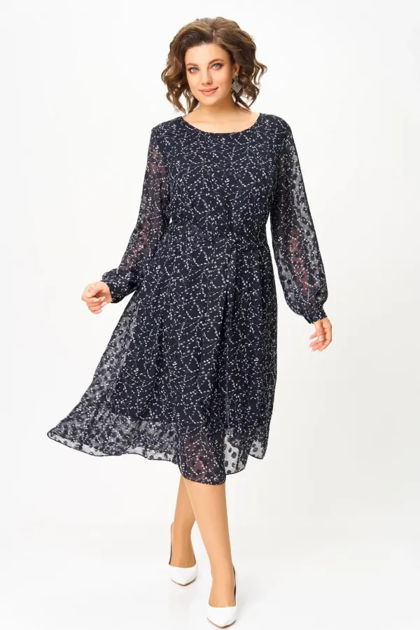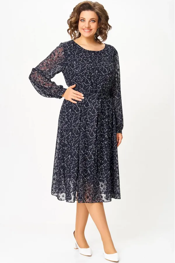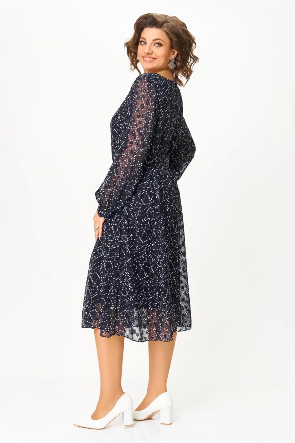 Платье полуприлегающего силуэта из фактурной шифоновой ткани с тиснёным узором на трикотажной подкладке. Полочка с отрезными рельефами, спинка с центральным швом и рельефами. Горловина округлой формы. Рукав втачной, длинный внизу со сборкой и манжетой, которая застёгивается на петлю и пуговицу.