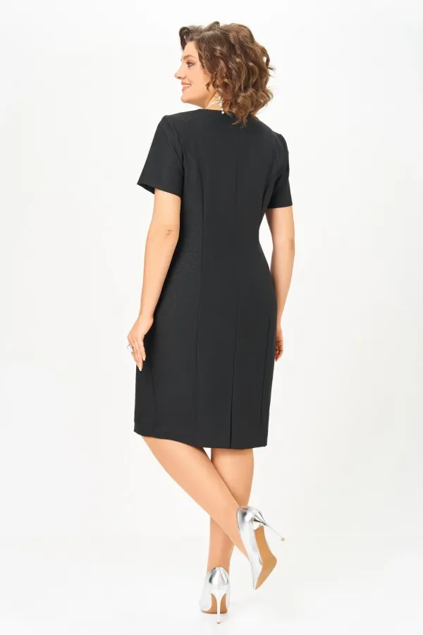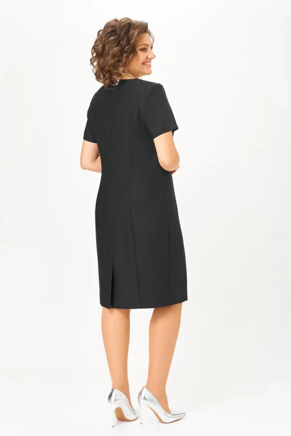 Платье полуприлегающего силуэта из мягкой поливискозной ткани. По полочке выполнены рельефные швы, по спинке рельефные швы, средний шов со шлицей и застёжка на потайную тесьму-молнию. Горловина круглая, обработана обтачкой. Рукав втачной, короткий.