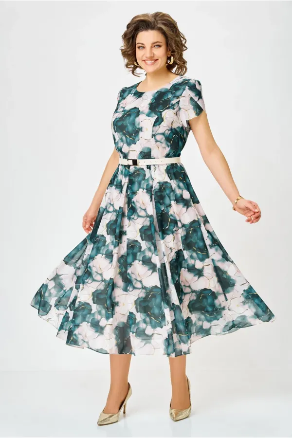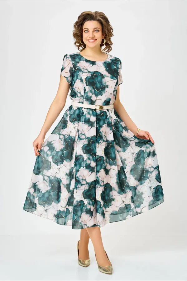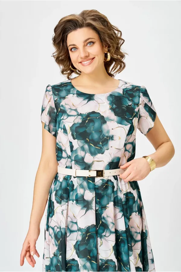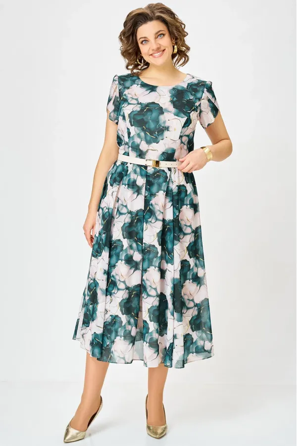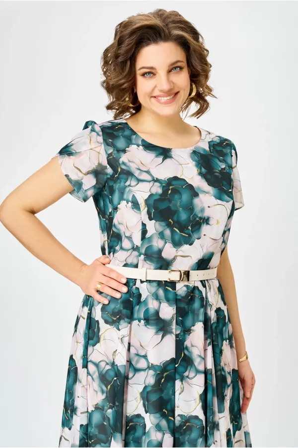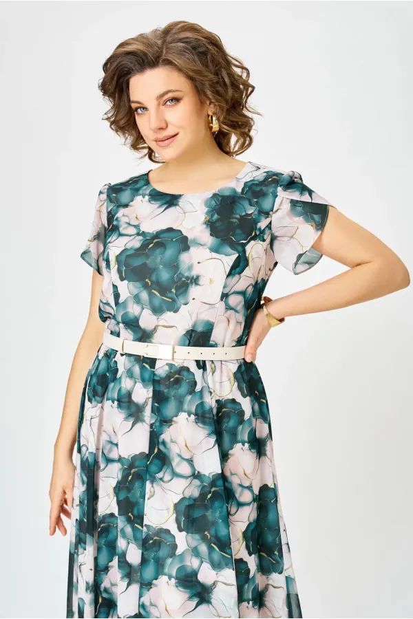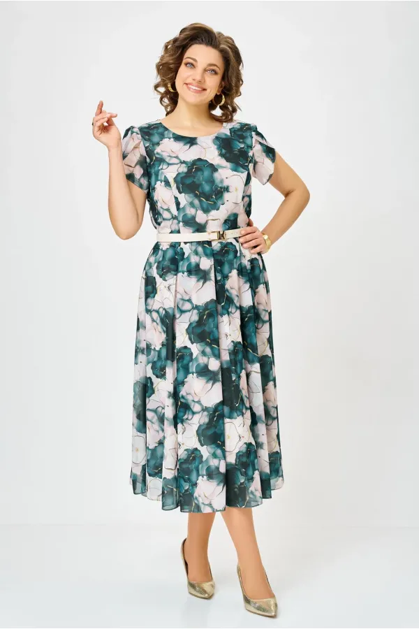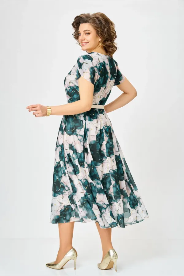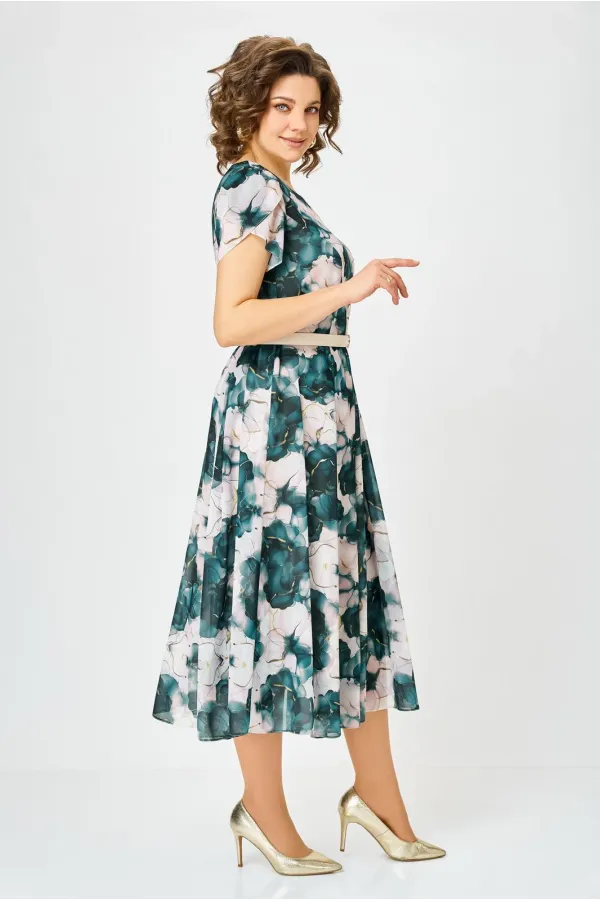 Платье из шифона на трикотажной подкладке, Х-образного силуэта с полуприлегающим лифом. Платье отрезное по линии талии. По переду лифа расположены рельефы, по спинке лифа талиевые выточки. Юбка расклешенная из шести клиньев со встречными складками по линии талии. В среднем шве спинки предусмотрена потайная тесьма- молния. Рукав втачной покроя тюльпан, длина рукава 15 см.