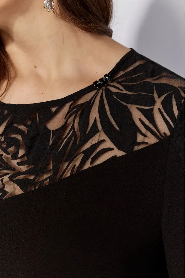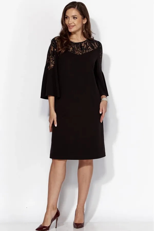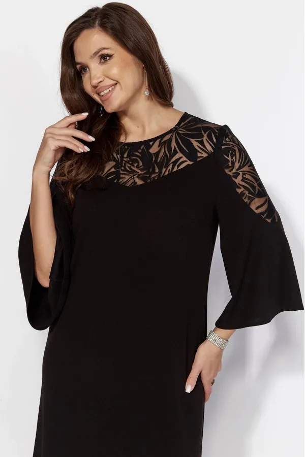 Платье женское А-образного силуэта с втачным рукавом длинной 3/4. Рукав расширенный к низу , с фигурной вставкой из отделочной ткани. По переду нагрудные вытачки и кокетка. Вырез горловины круглоф формы с ассиметричным пришивным декором. По спинке средний шов, кокетка сложной формы с разрезом. Застежка сзади на навесную петлю и отделочную пуговицу. Вставкирукавов и кокетки выполнены из отделочной ткани(прозрачная органза с рисунком.)