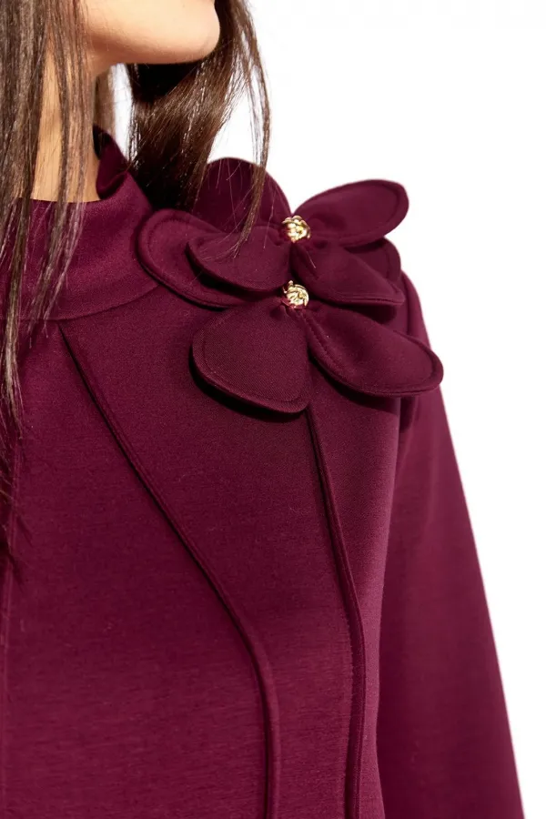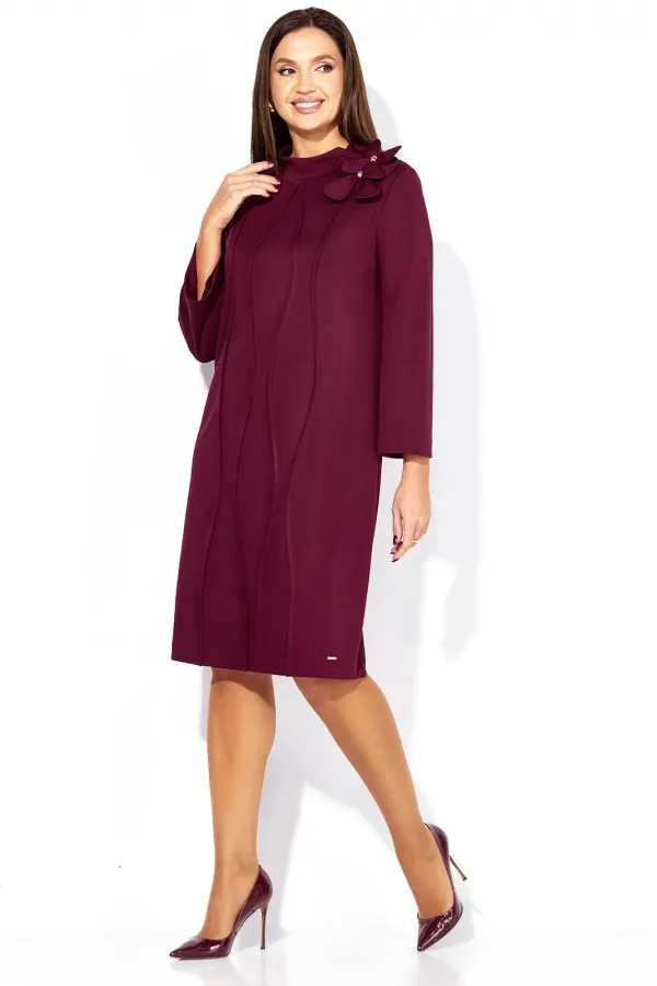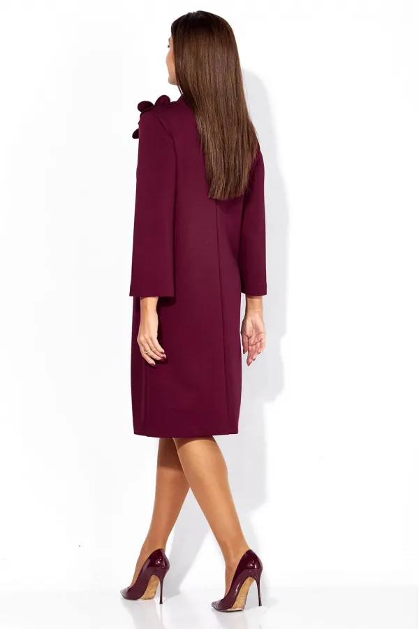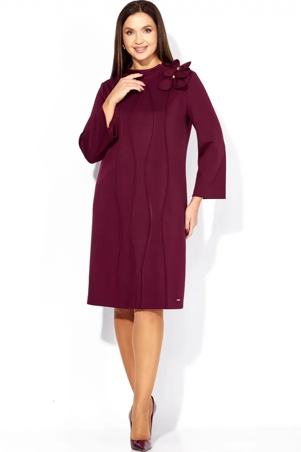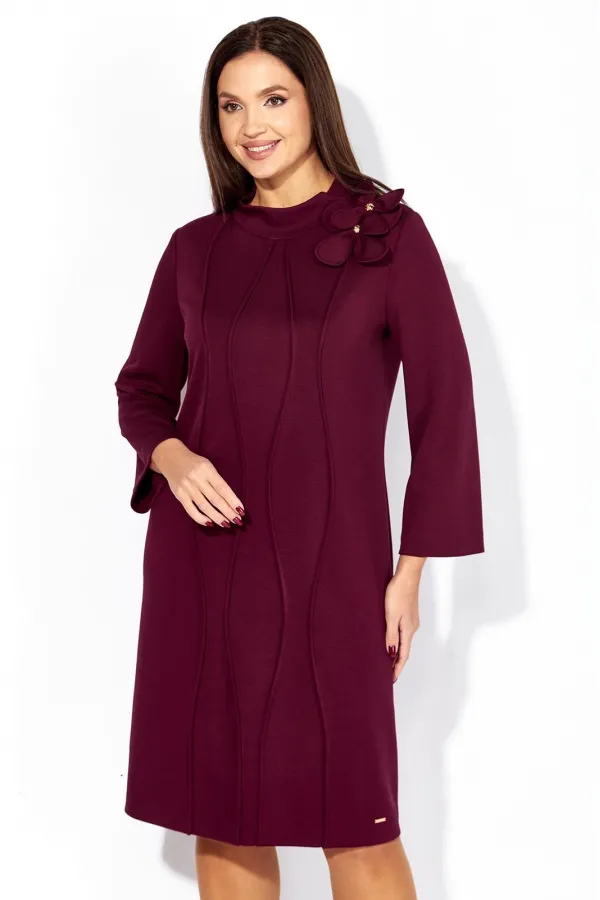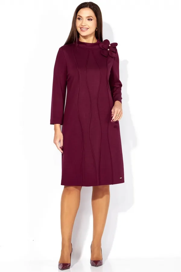 Платье женское, чуть А-силуэта, с втачным рукавом, длинной 7/8. По центу переда объемные , фигурные рельефы. Горловина оформлена небольшой мягкой стойкой. Декором служат съемные цветки-броши. По низу платья отделочная нашивка. Спинка со средним швом. Платье изготовлено из трикотажного полотна тенсел.