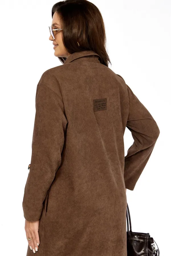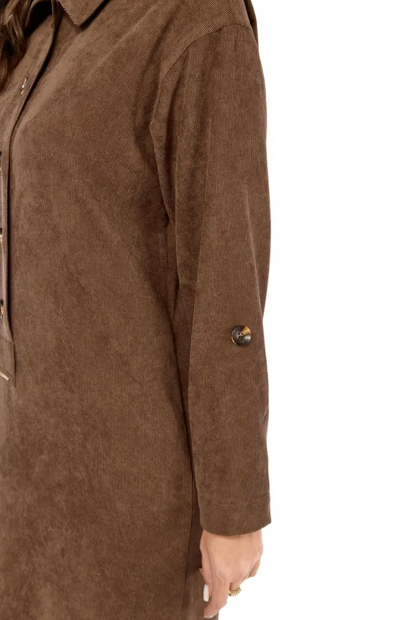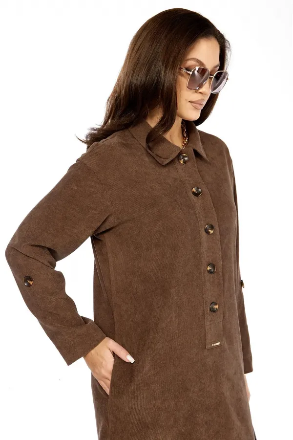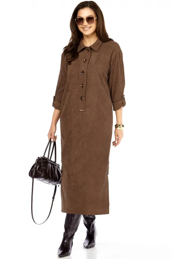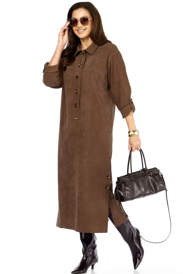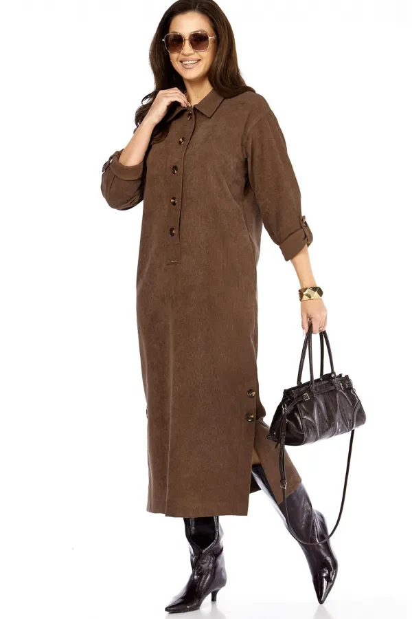 Стильное, свободное, красивое и теплое женское платье из микровельвета , хорошего качества. Прямой силуэт, отложной воротник, с планкой на пуговицах, по низу планки лейба. По бокам платья с обеих сторон шлица с двумя пуговицами. рукав длинный, но по желанию можно сделать короче за счет паты с пуговицей. Сзади платье цельное, без шва, с аппликацией в тон платья. Длина платья по спинке от плеча 130 см.