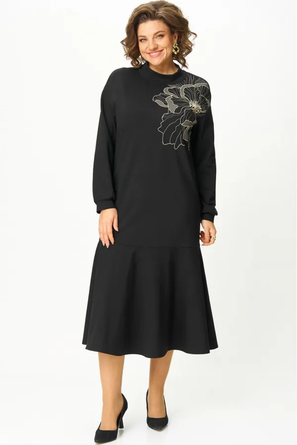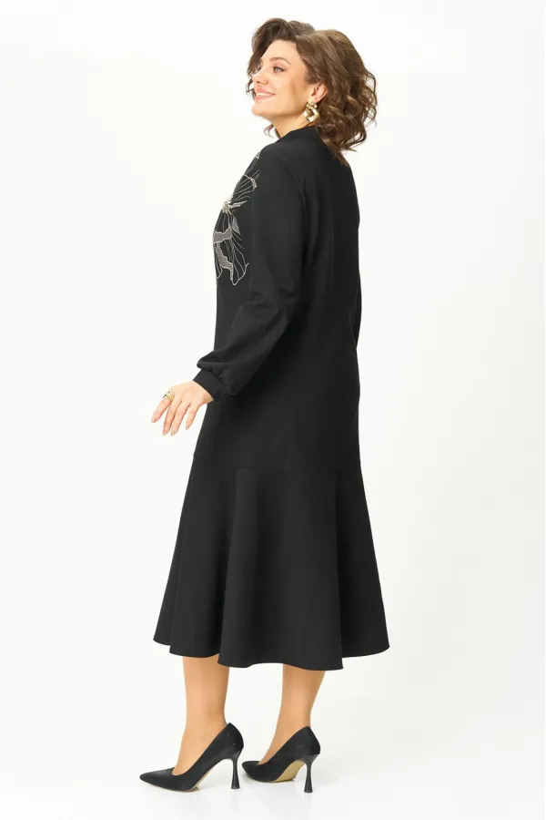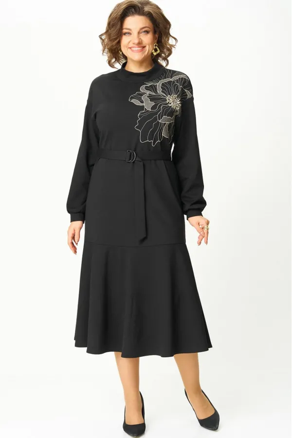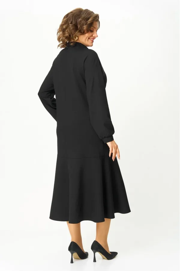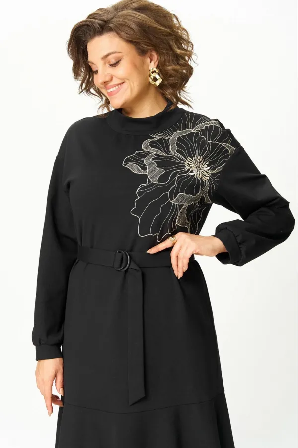 Платье из трикотажного полотна прямого силуэта со спущенной линией плеча, воланом по низу. Спинка со средним швом и застежкой на «молнию» в верхней части и по стойке. Рукав втачной одношовный на притачной манжете. Вырез горловины круглый. Воротник стойка. Есть съемный пояс из основной ткани с пряжкой.