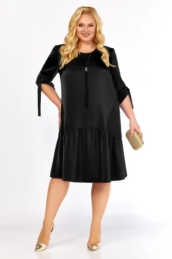 Нарядное платье лаконичного свободного силуэта элегантно подчеркнёт вашу красоту и придаст образу утончённость. Модель выполнена из стрейчевой струящейся ткани с матовым блеском. Перед с нагрудными вытачками, декоративными клиньями(переходящими на спинку), по низу с воздушным воланом со сборкой. Спинка со средним швом и воланом. Округлый вырез горловины дополнен декоративным элементом из основной ткани, плавно спадающим вдоль переда. Рукав втачной с вертикальным швом, длиной ниже локтя, по низу с завязывающейся патой. Отделкой комплекта служит фурнитура (может отличаться от представленной на фото).