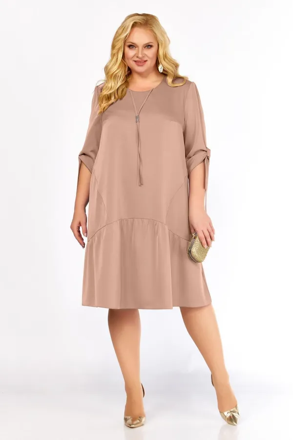 Нарядное платье лаконичного свободного силуэта элегантно подчеркнёт вашу красоту и придаст образу утончённость. Модель выполнена из стрейчевой струящейся ткани с матовым блеском. Перед с нагрудными вытачками, декоративными клиньями(переходящими на спинку), по низу с воздушным воланом со сборкой. Спинка со средним швом и воланом. Округлый вырез горловины дополнен декоративным элементом из основной ткани, плавно спадающим вдоль переда. Рукав втачной с вертикальным швом, длиной ниже локтя, по низу с завязывающейся патой. Отделкой комплекта служит фурнитура (может отличаться от представленной на фото).