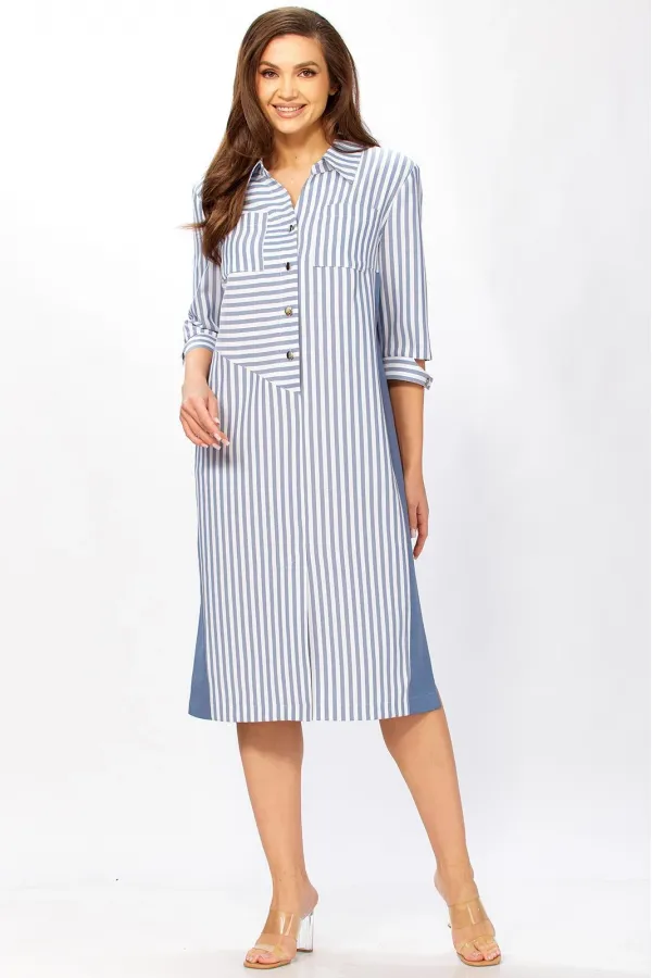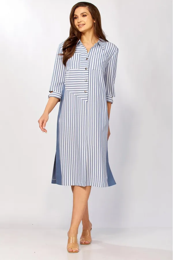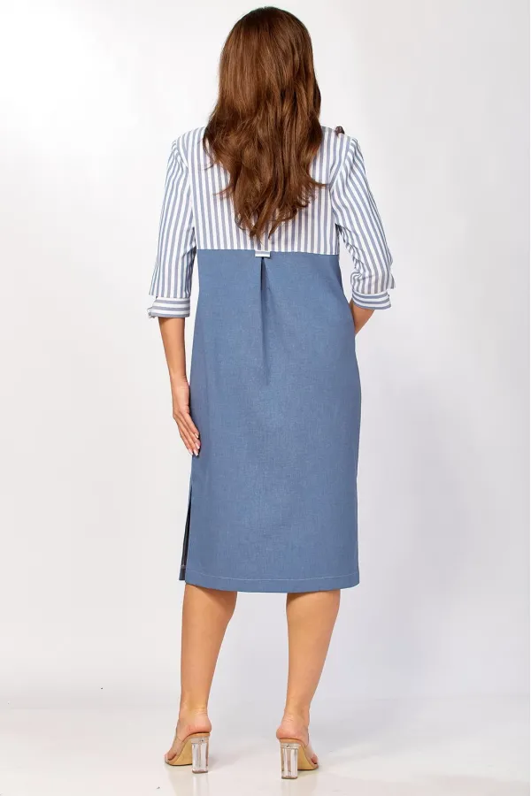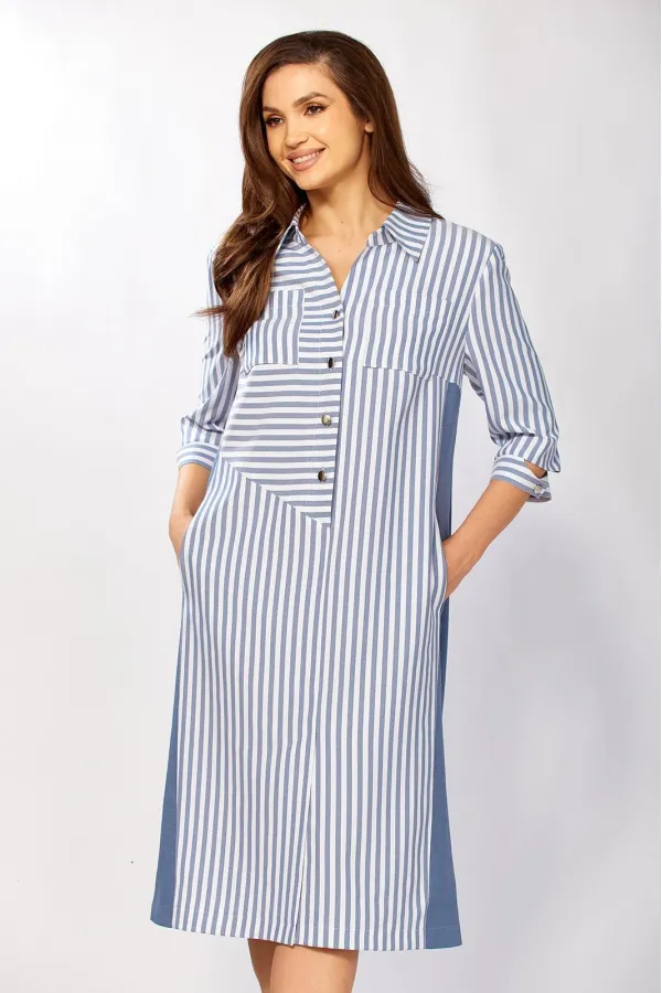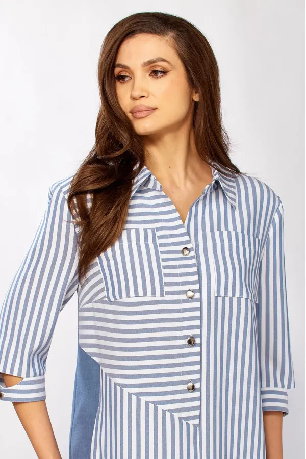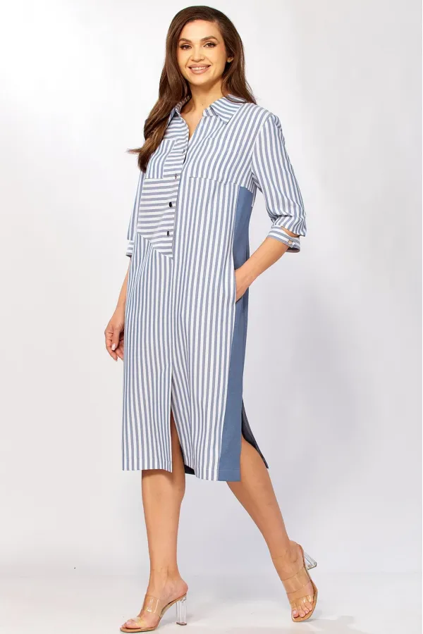 Стильное платье прямого силуэта, комбинированное из двух видов ткани. Продуманные линии кроя выгодно обрамляют фигуру, а сочетание однотона и полоски добавляет образу графичности и стиля.
