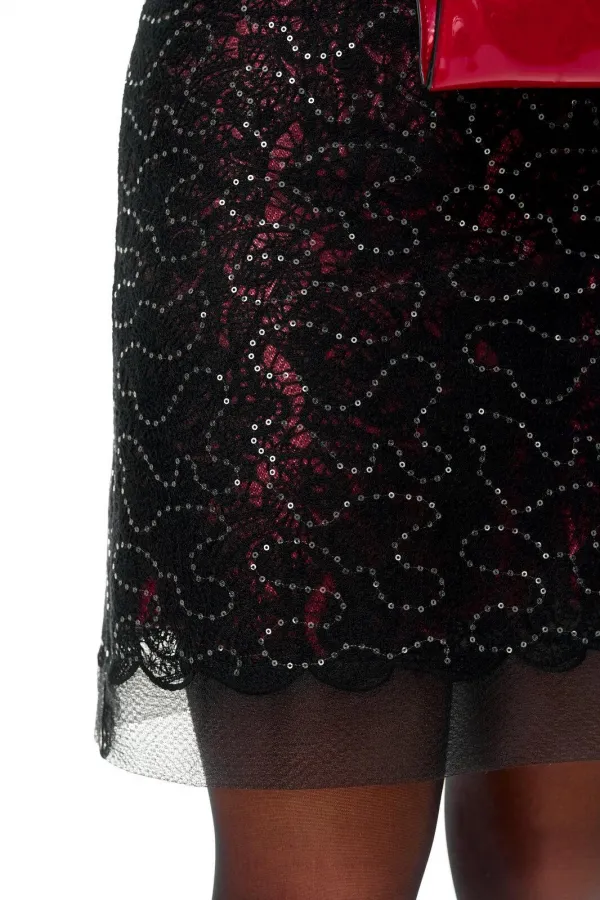 Нарядное соблазнительное mini- платье из плотного кружева с легким блеском на красной жаккардовой подкладке. Полуприлегающего силуэта с небольшим расклешением к низу. Горловина круглая. Застежка молния по спинке. Рукав ц... Читать далее...