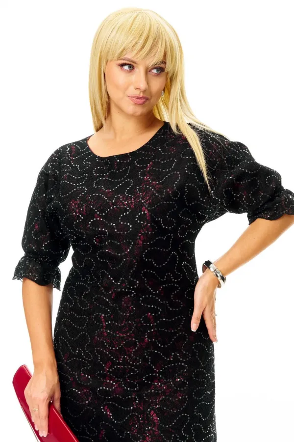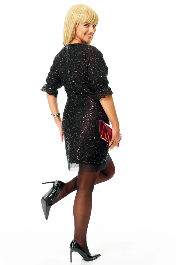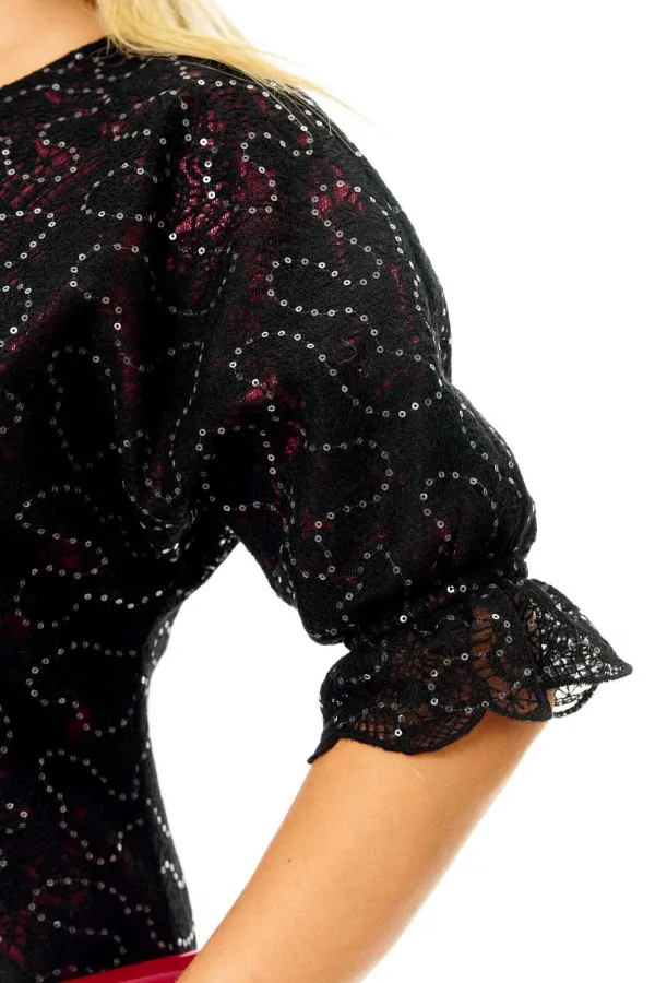Нарядное соблазнительное mini- платье из плотного кружева с легким блеском на красной жаккардовой подкладке. Полуприлегающего силуэта с небольшим расклешением к низу. Горловина круглая. Застежка молния по спинке. Рукав цельнокроеный с воланом.