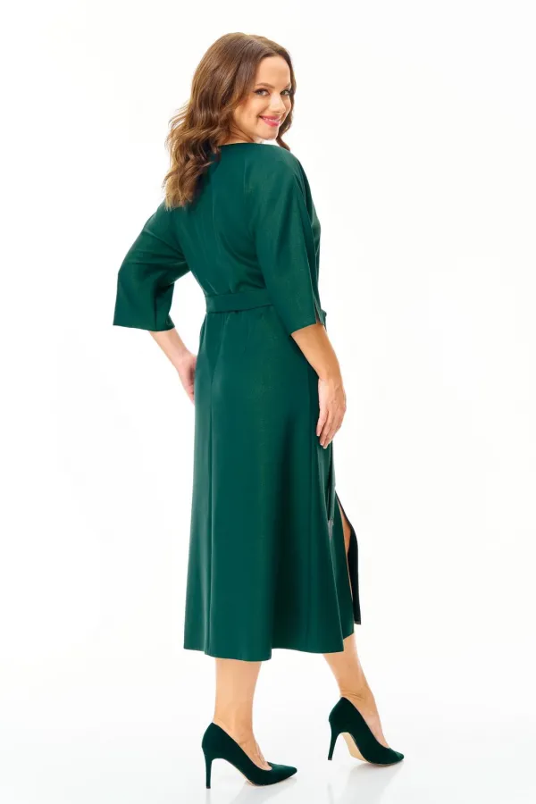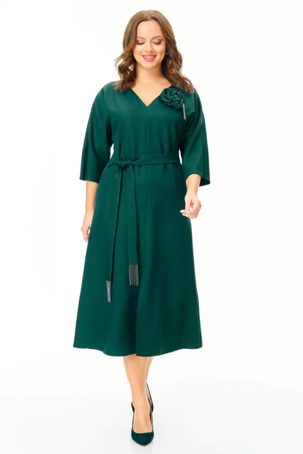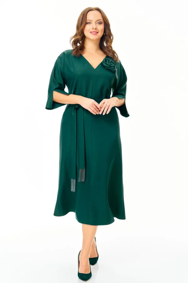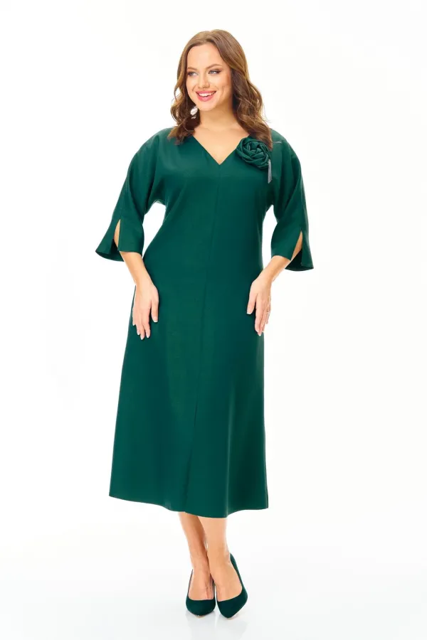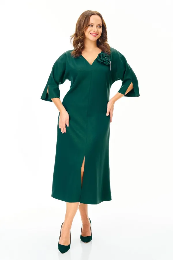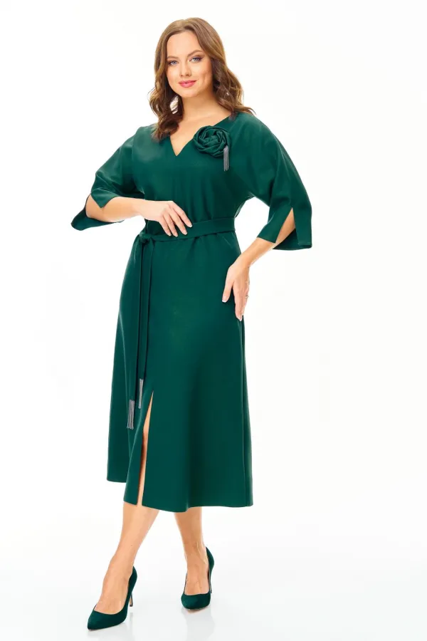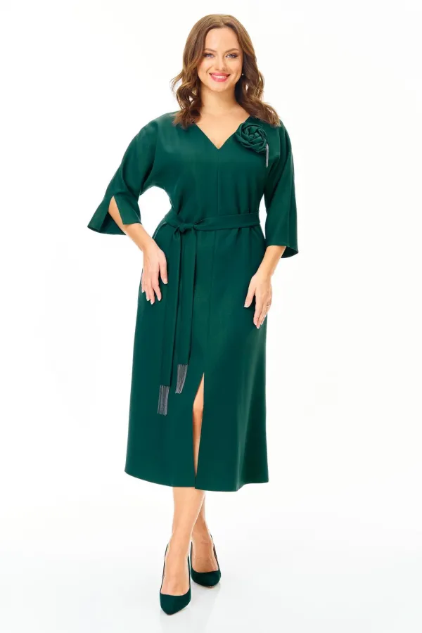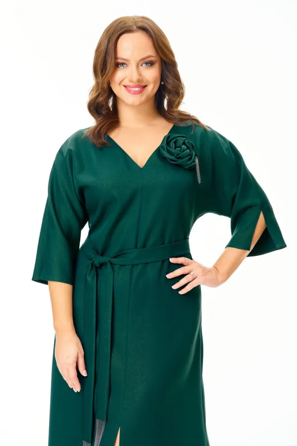Нарядное элегантное платье из плотной ткани с легким блеском. Украшено съемным цветком. Полуприлегающего силуэта с небольшим расклешением к низу. Горловина V-образной формы. Застежка молния по спинке. Рукав цельнокроеный с разрезом. По переду невысокий соблазнительный разрез. Пояс съемный. Платье без подкладки.
