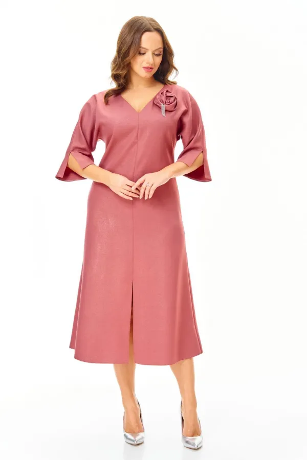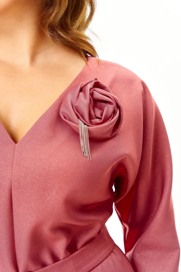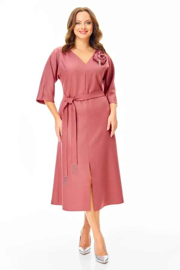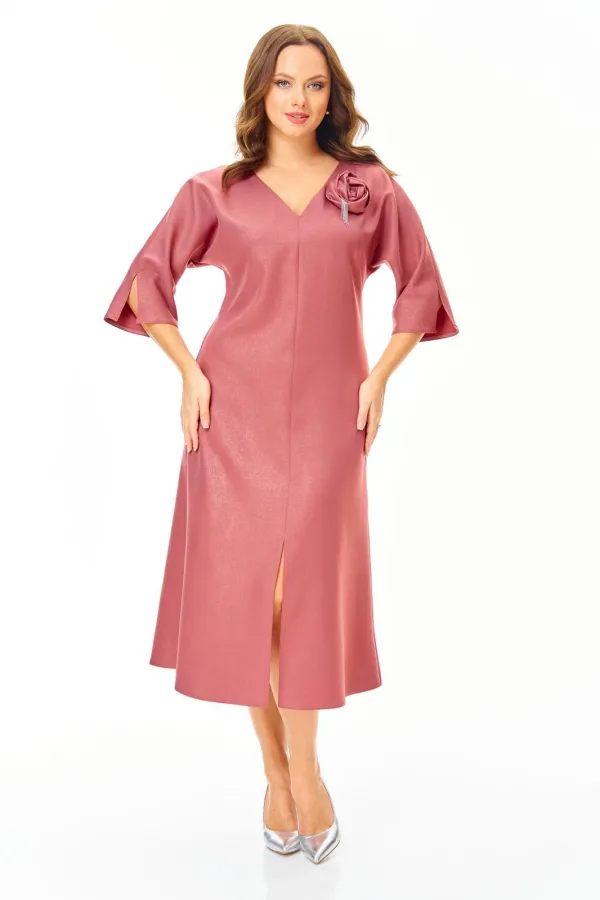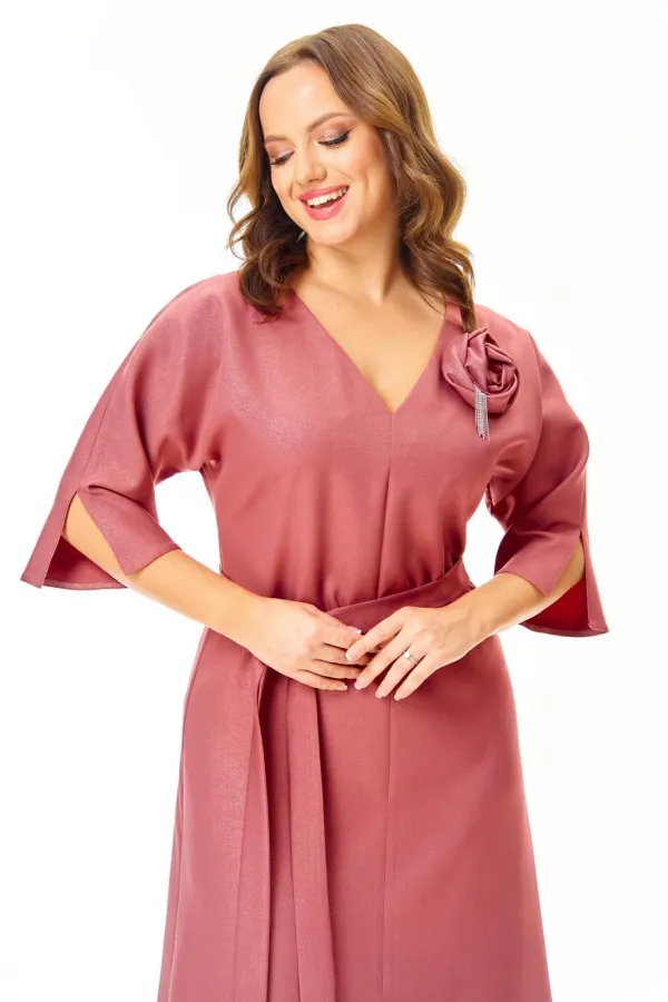 Нарядное элегантное платье из плотной ткани с легким блеском. Украшено съемным цветком. Полуприлегающего силуэта с небольшим расклешением к низу. Горловина V-образной формы. Застежка молния по спинке. Рукав цельнокроеный с разрезом. По переду невысокий соблазнительный разрез. Пояс съемный. Платье без подкладки.