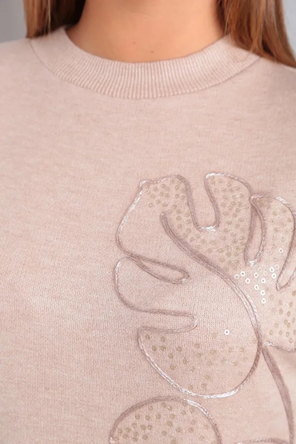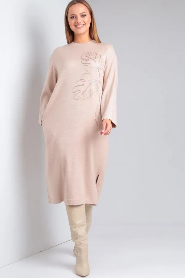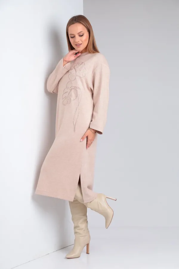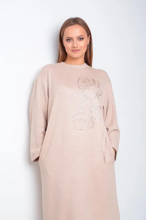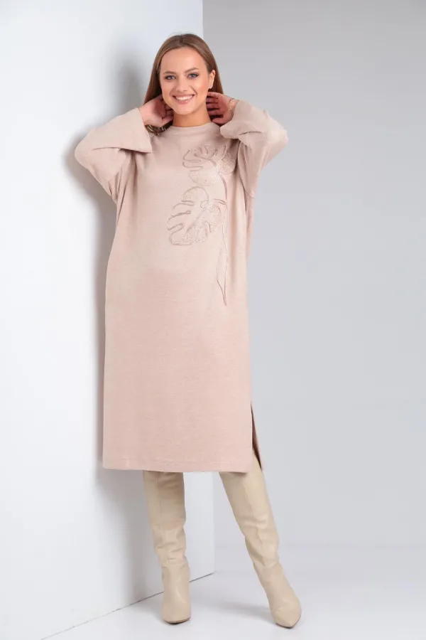 Платье женское трикотажное прямого силуэта с декоративной вышивкой по переду. Линия плеча спущена, рукав втачной длинный. Горловина с планкой из основной ткани. Перед и спинка цельные, в боковых швах карманы, с левой стороны разрез.